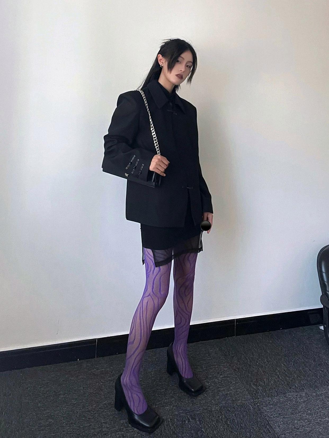 在冬季,紫色长筒袜与深色系服装搭配,如黑色、灰色或深蓝色,可以打破冬日的沉闷,带来一丝轻盈与活力。那深色的外套,配上紫色的长筒袜,就像是在厚重的历史画卷中添上了一笔亮丽的色彩,让人眼前一亮。