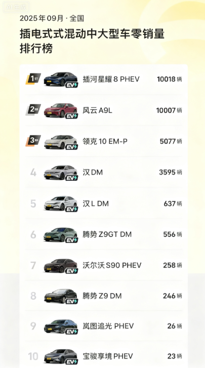 最近9月的插电式混动中大型车零售销量榜刚出炉,这个细分市场早就挤满了各品牌的主力车型,尤其是18万以上的高端区间,想冲上前排更是要凭真本事。没想到有款新上市的中大型混动轿车格外突出,不仅在插电式混动中大型车总榜里拿下第三,还在18万以上插电式混动轿车榜里冲到第二,它就是领克10EM-P,单月卖出5077辆。能在竞争这么激烈的区间站稳脚跟,这份销量成绩背后,显然离不开实打实的产品力支撑。