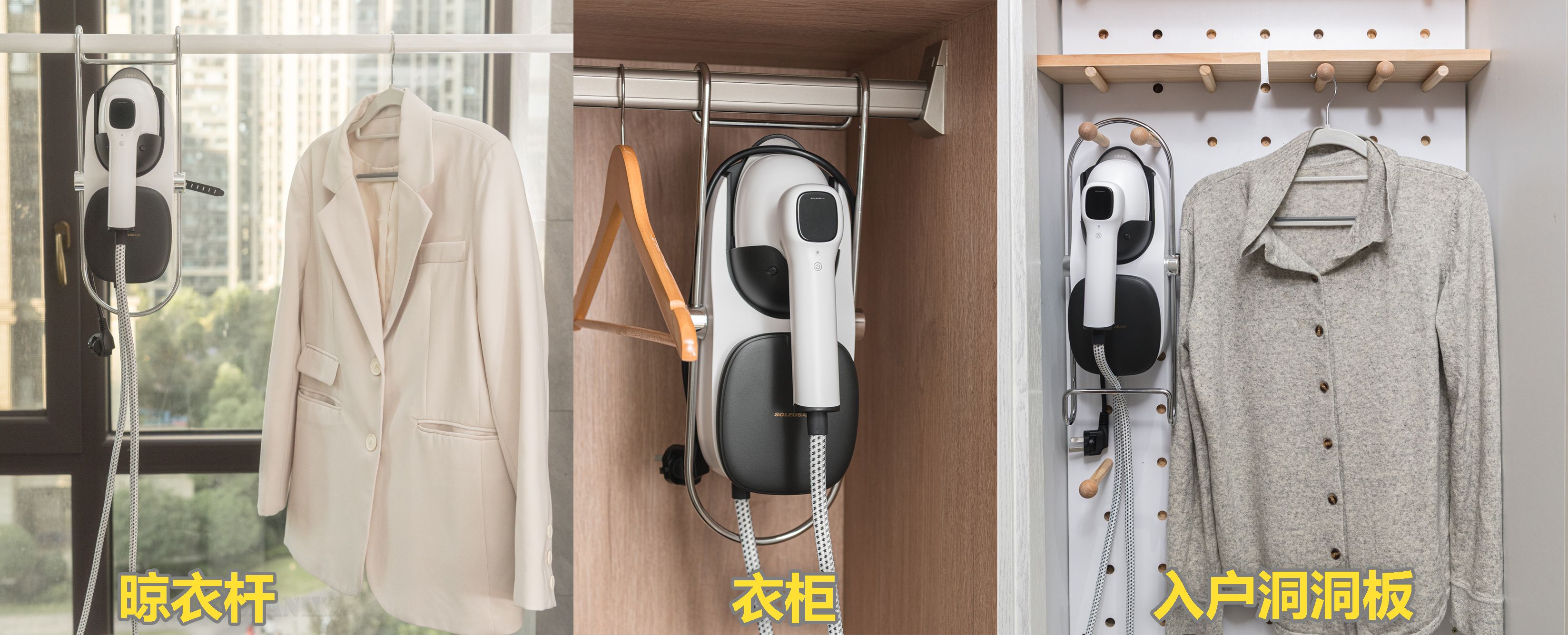 收纳方面,这款挂烫机真正为小户型考虑的,它支持双模式挂杆和隐藏式电源线,可90°卡入衣柜或壁挂。像落地衣架、挂钩甚至门把手都可以悬挂,随挂随用,真的是把挂烫机的收纳方式发挥到极致。