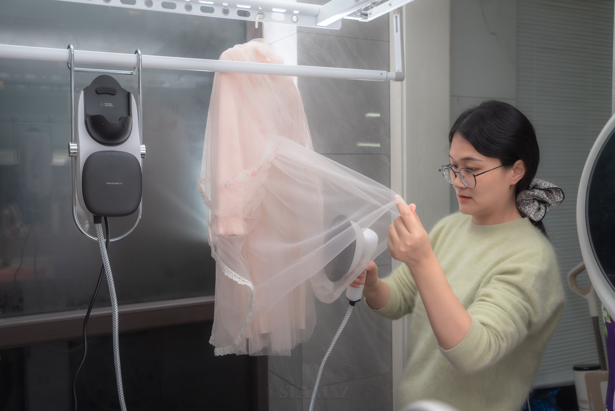 升降晾衣杆调到合适高度,站姿使用不用弯腰,用起来一点不累人,水箱与熨头分离的设计避免了传统挂烫机笨重导致的腕部酸痛,长时间使用也能保持舒适。