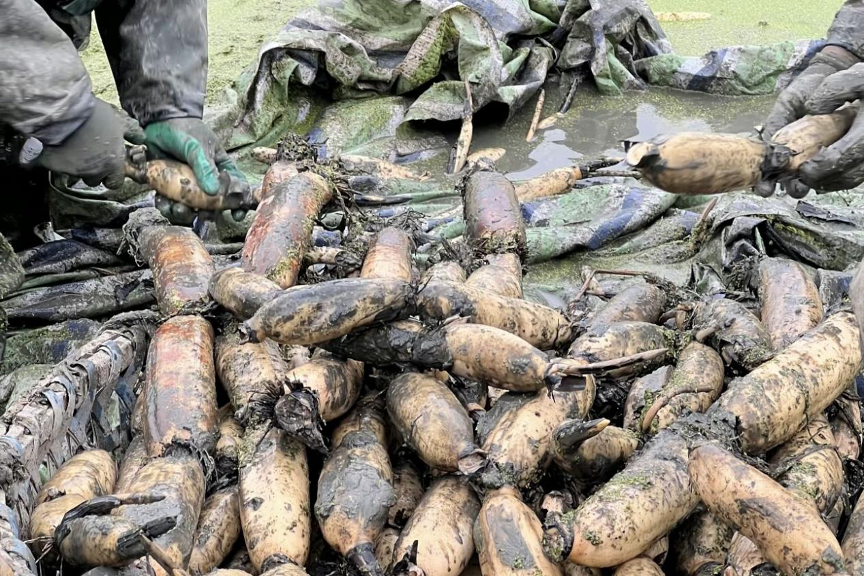 老冯介绍,如今销路广价格好,得益于烟草局与村两委前期主动对接县商务局扩展了本地商超销路,申请了绿色认证提价,现在每天下午2点左右,就有收购商赶来将当天采挖的莲藕装车,除了销往本地市场,现在还会销往武汉周边等地。