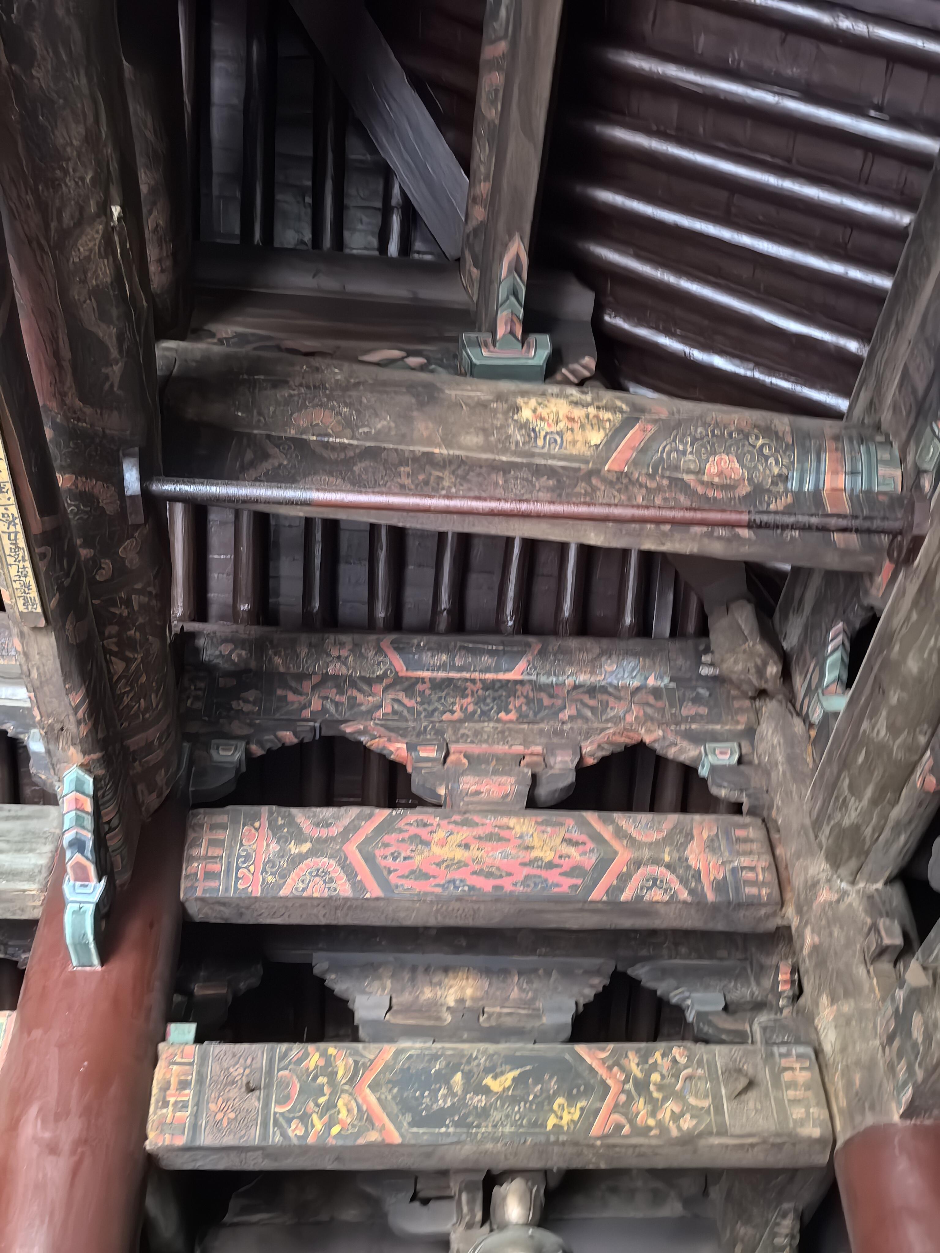 对于彩画历经 600 多年还能保持清晰艳丽,没有发黑,我们心中满是疑惑。道士笑着为我们解答。原来在 1988 年,玄天观进行了落架大修,专业的修复人员运用精湛的技艺,对彩画进行了精心的修复和保护。而在此前的动乱年代,这座道观幸运地被用作仓库。仓库的用途让它避开了外界的破坏,那些珍贵的彩画和建筑结构也因此得以保存下来。听到这里,我们不禁感慨,历史的发展总是充满了意外和巧合,这座道观能够历经沧桑留存至今,实在是一件幸事。