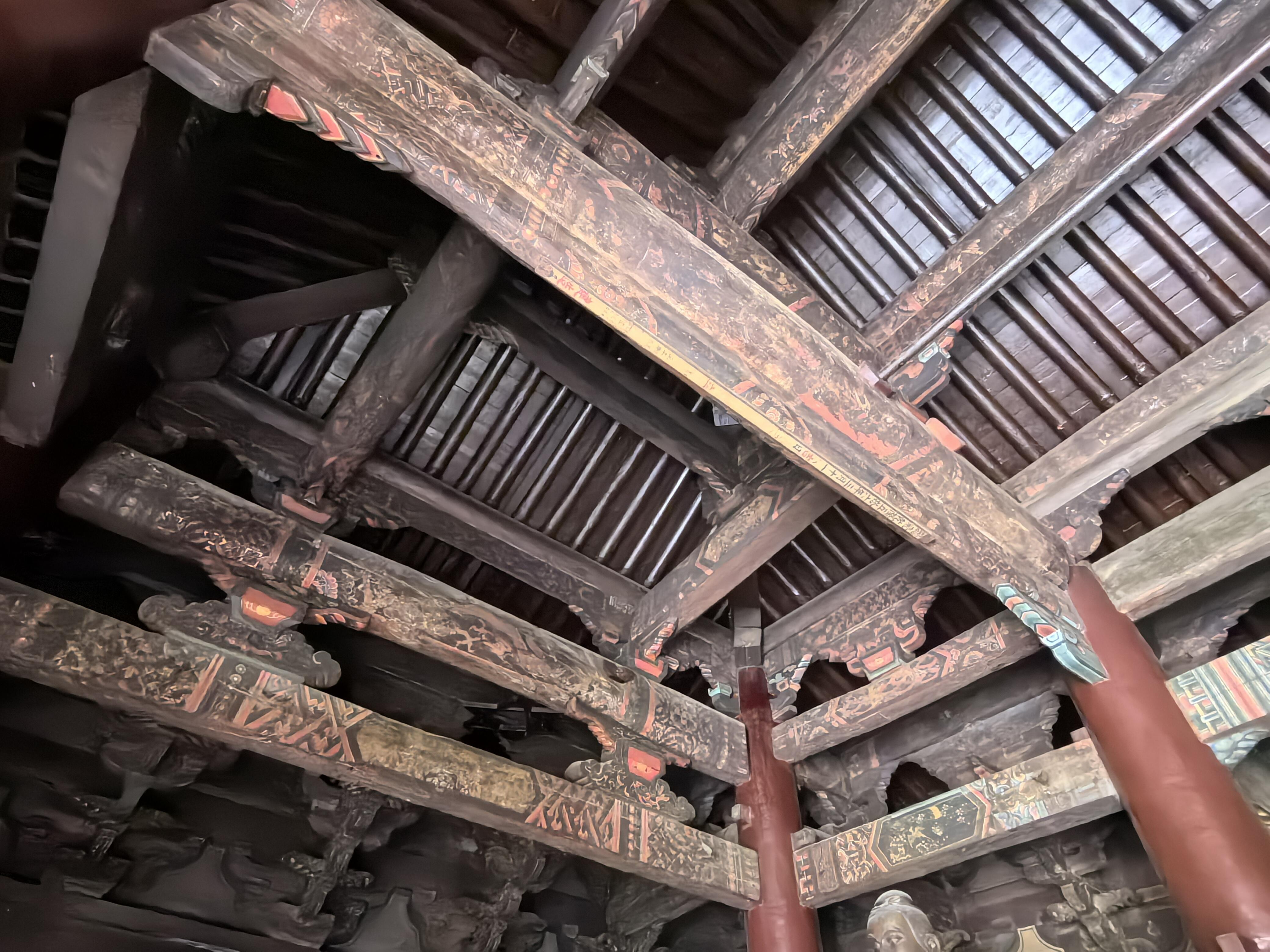 在道观里,一位健谈的道士热情地向我们介绍着这座道观的历史。在他的指点下,我们惊喜地发现了檀下的墨书“洪武十五年”题记。这几个字虽然历经岁月,却依然清晰可辨。它们就像时光的标签,确凿地证明了这座道观的建造年代,也让我们与六百多年前的那个时代有了更直接的联系。想象着当年工匠们在这里挥毫写下这几个字时的场景,心中不禁涌起一股对历史的敬畏之情。