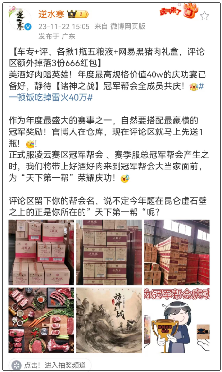对赛事的高度重视,自然延伸到对冠军队伍的犒劳之上。《逆水寒》“诸神之战”的庆功宴,规格逐年升级,尽显阔绰。曾有一届庆功宴,网易直接包下整片沙滩作为宴请场地,平日里难得一见的茅台,在宴会上如同普通饮品般供宾客自由取用,这般手笔堪称行业罕见。