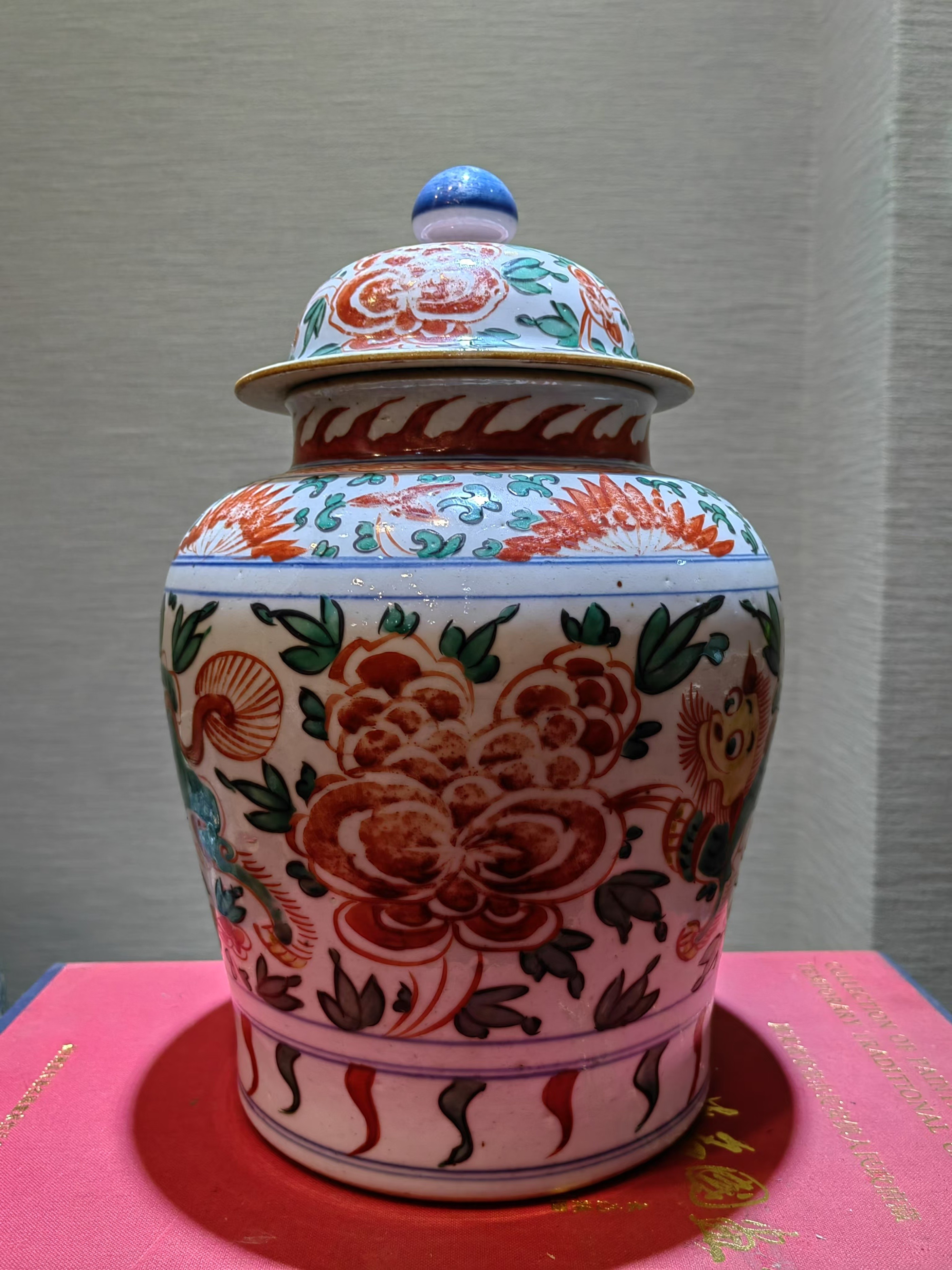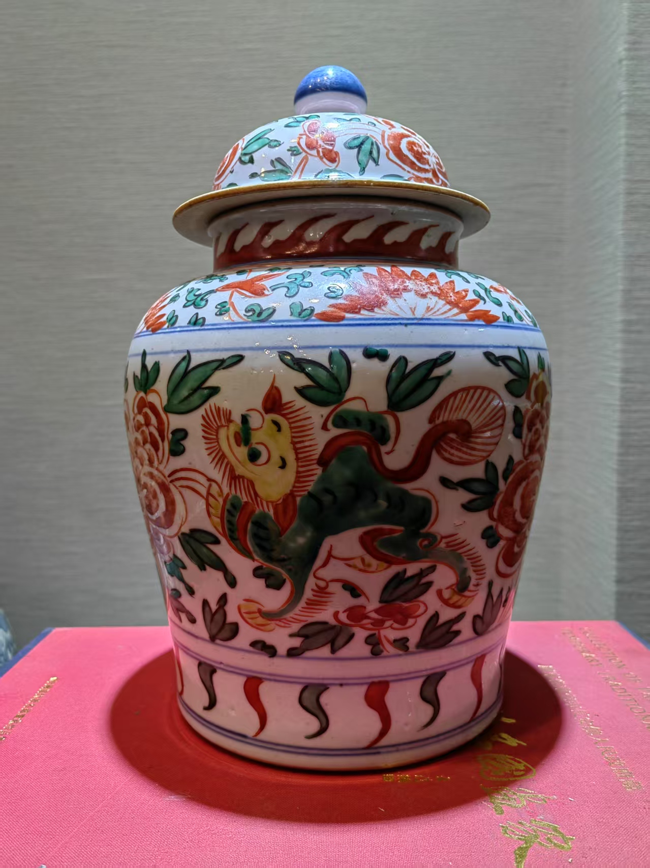 明末清初(约17世纪)是中国瓷器发展的重要过渡期,青花红绿彩瓷器以其独特的装饰风格和工艺技法备受瞩目。其中,“青花红绿彩狮子穿牡丹纹将军罐”是这一时期的典型代表,展现了明末清初瓷器的艺术特色。