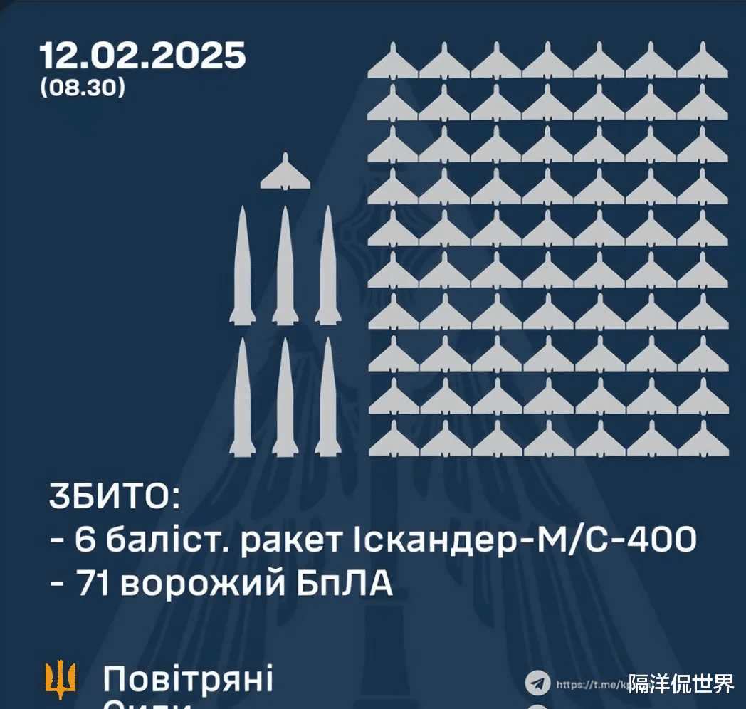 截至 2 月 12 日(基辅时间)上午 8 点 30 分,确认在哈尔科夫、波尔塔瓦、苏梅、基辅、切尔卡瑟、切尔尼戈夫、基洛沃赫拉德、日托米尔、第聂伯罗彼得罗夫斯克、赫尔松和尼古拉耶夫地区击落了 6 枚伊斯坎德尔-M 弹道导弹和 71 架沙赫德型攻击无人机。