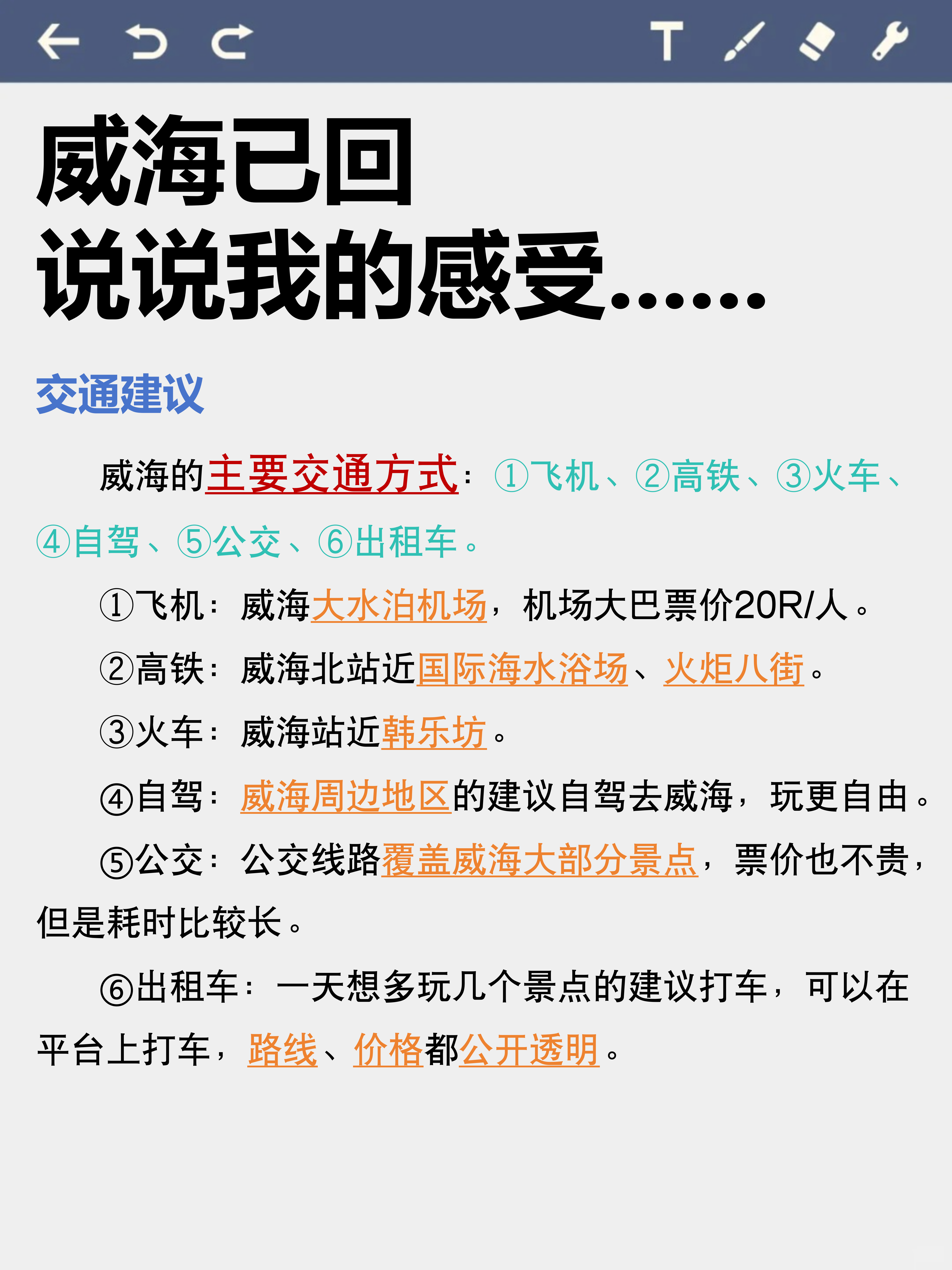 🚌关于威海的交通:威海的主要交通方式:①飞机、②高铁、③火车、④自驾、⑤公交、⑥出租车。