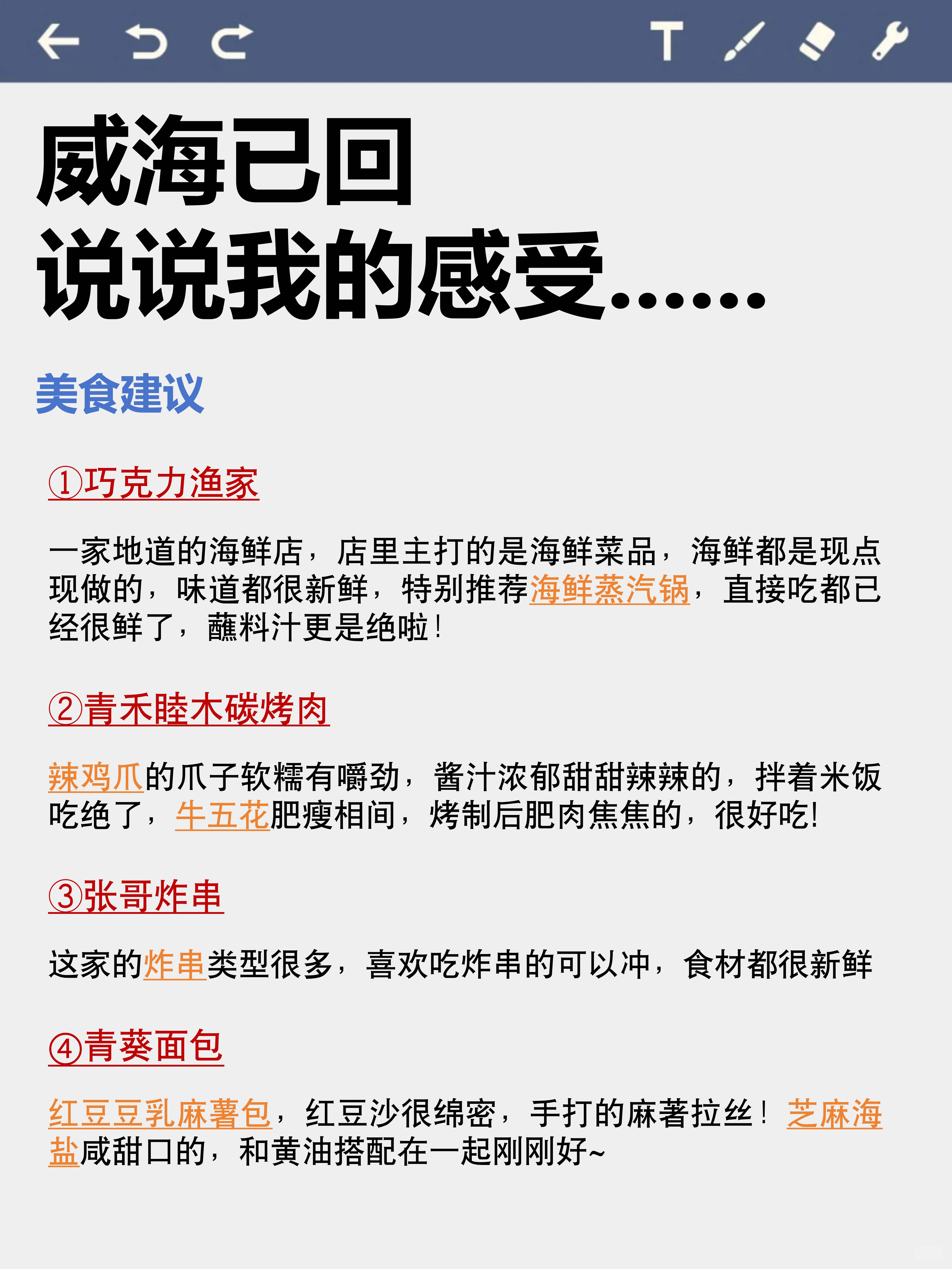 😋关于威海的美食:①巧克力渔家、②青禾睦木碳烤肉、③张哥炸串、④青葵面包