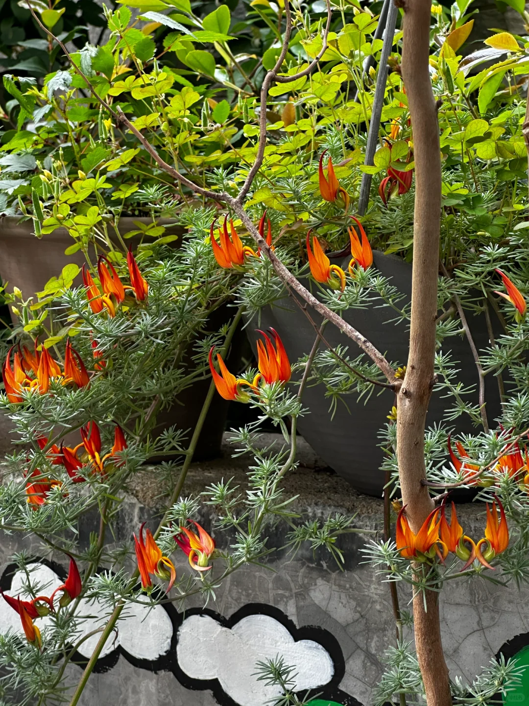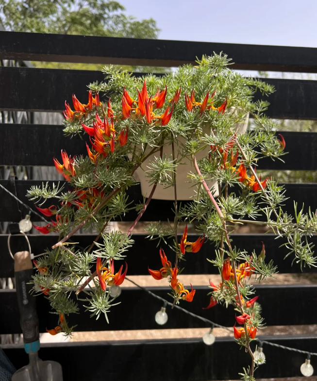 枝条柔软纤长,可以垂吊观赏;绿色的叶片常常散发出银灰色的光泽,十分独特;整体株型飘逸,会在炎热的夏季开出火焰状的花朵,极具观赏价值。