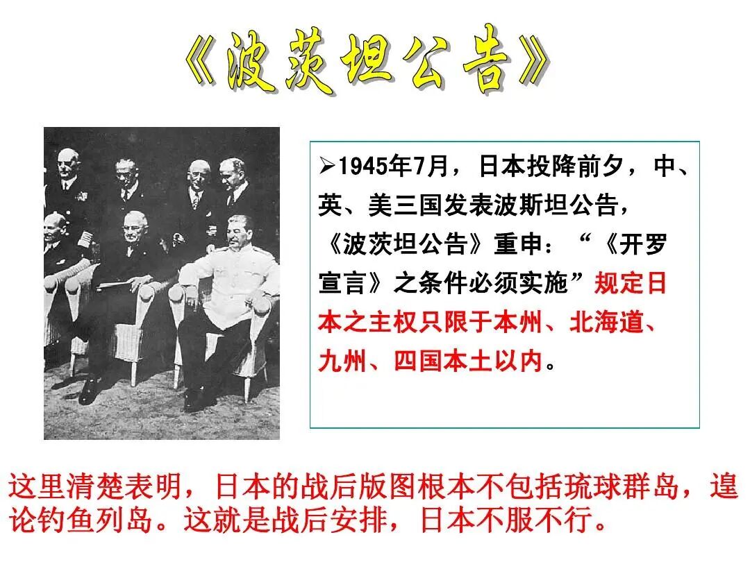 如果说甲午战争是琉球命运的第一次大转折,那二战就是第二次,也是“主权未定”的关键伏笔。1945年,日本战败投降,根据《开罗宣言》和《波茨坦公告》,明确规定“日本所窃取于中国之领土,例如东北四省、台湾、澎湖列岛等,归还中国。其他日本以武力或贪欲所攫取之土地,亦务将日本驱逐出境”。这里的“其他土地”,就包括琉球群岛。