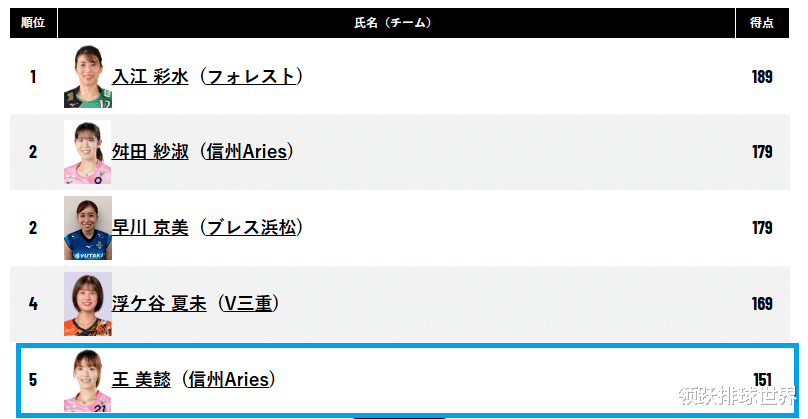 值得一提的是,中国女排球员王美懿继续以首发接应身份登场,发挥稳定。根据官方公布的数据情况,截至目前,她在本赛季已砍下 151分(包括130个扣球得分+18个拦网得分+3个ACE),并强势跻身V联赛球员得分榜前五名,是信州白羊座进攻端的绝对核心。