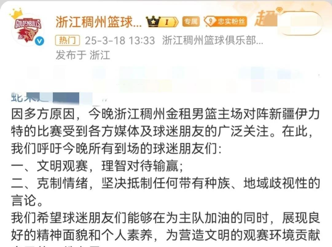 格局很大!浙江稠州官方呼吁球迷文明看球,千万不要针对哈雷尔