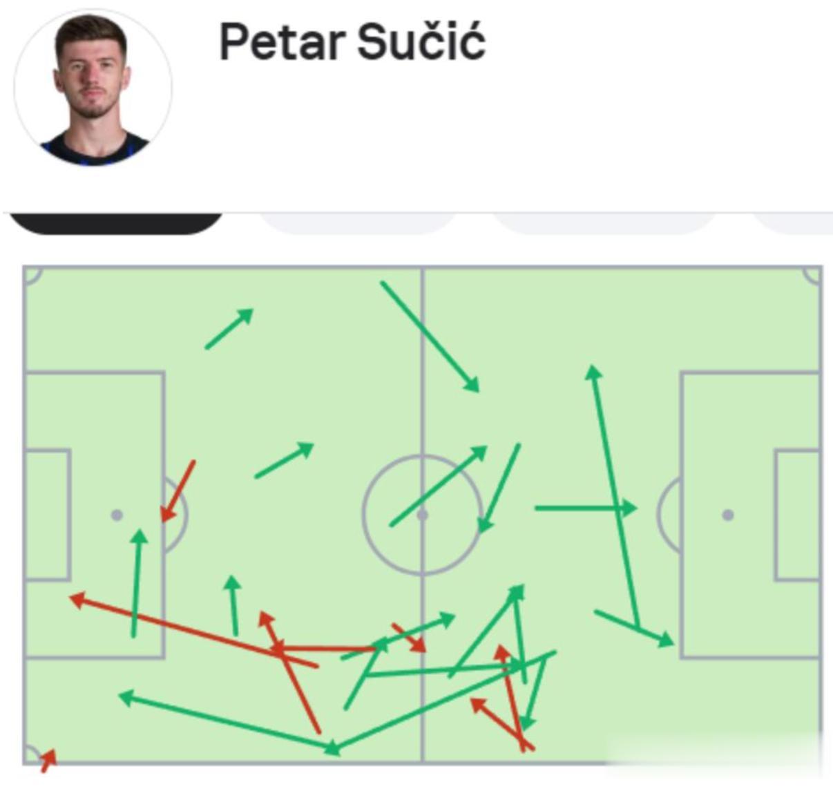 之前几场比赛,苏契奇打左路居多,他一多半的触球都是在边线附近(比如下图就是他上一次首发对阵热那亚时的触球区域,国米向左攻)。