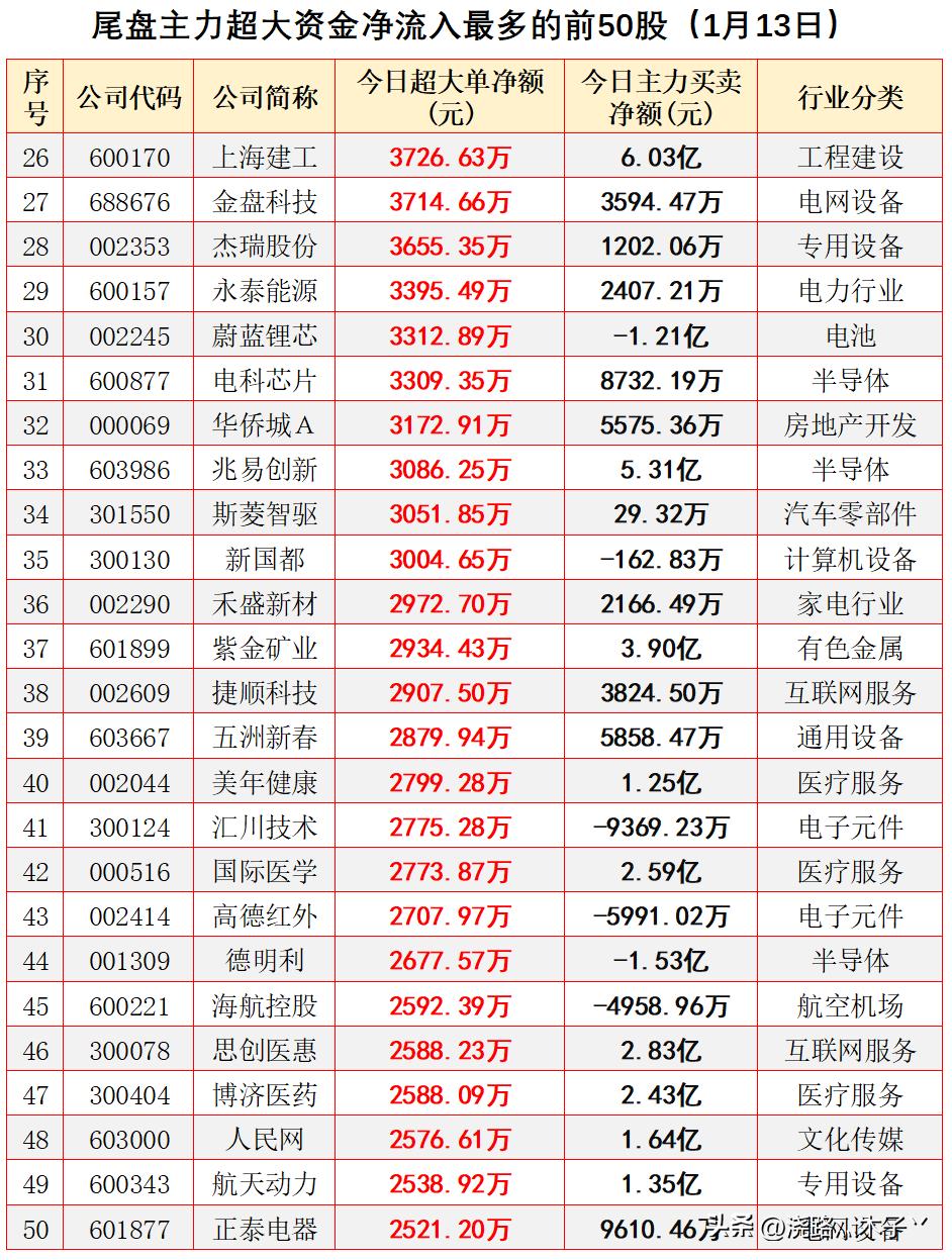 以下所列为今日尾盘30分钟内,主力超大资金净买卖最大的各50只个股。这些个股是否潜藏短期机遇或风险,建议收藏起来甄别研判。