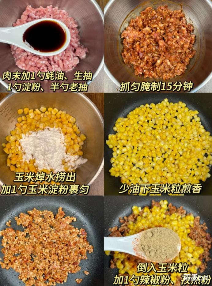 做这道菜,食材越家常越出彩。玉米粒用新鲜甜玉米剥粒最佳(香甜多汁),冷冻玉米粒也完全OK(方便省事);如果是整根玉米,对半切开后用刀贴着芯刮下来,颗粒完整又省力。肉沫选猪前腿肉或梅花肉,肥瘦比例3:7最理想,剁成细末(不用太碎,保留一点颗粒感更香)。再备点姜末、蒜末、葱花,提味增香全靠它们!