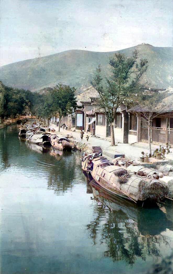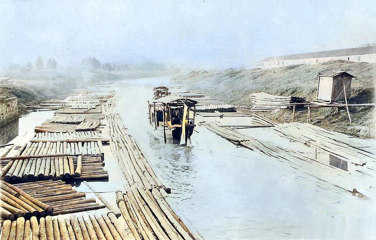 运河边上一个小码头,不少的木筏子被放置在河面上,使原本宽阔的河道变得非常狭窄。这些木筏是工人准备运输的木料,准备利用水流将木排运送到位于下游的目的地。