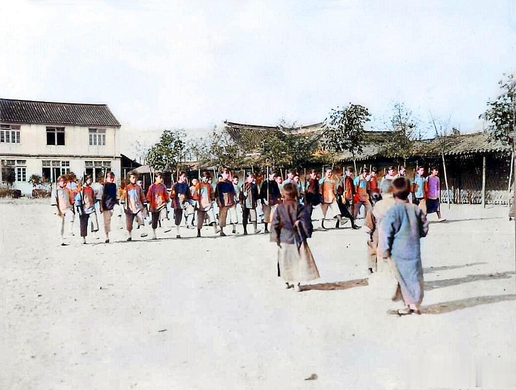 无锡一所公立学校的校园里,一群女学生扛着棍子正在进行队列训练,看情形似乎是在练习踢正步。队伍前面,站着几个穿着长袍或马褂的小男孩在看热闹。
