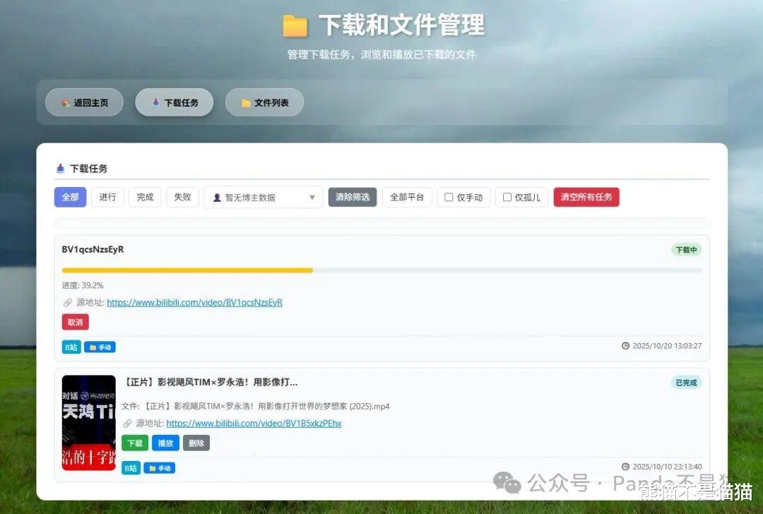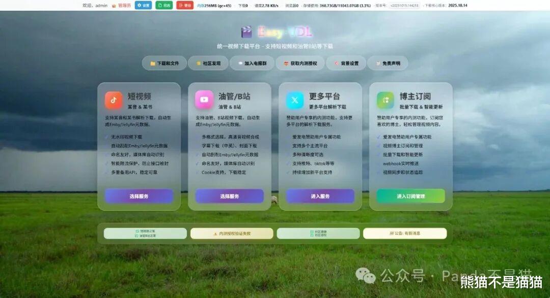 登录之后主界面是这样的,顶部能看到个账户信息、NAS的一些系统状态以及当前项目的版本号等等,下方则是功能区了。作者将其分为了短视频、油管与B站、更多平台以及博主订阅四个板块。