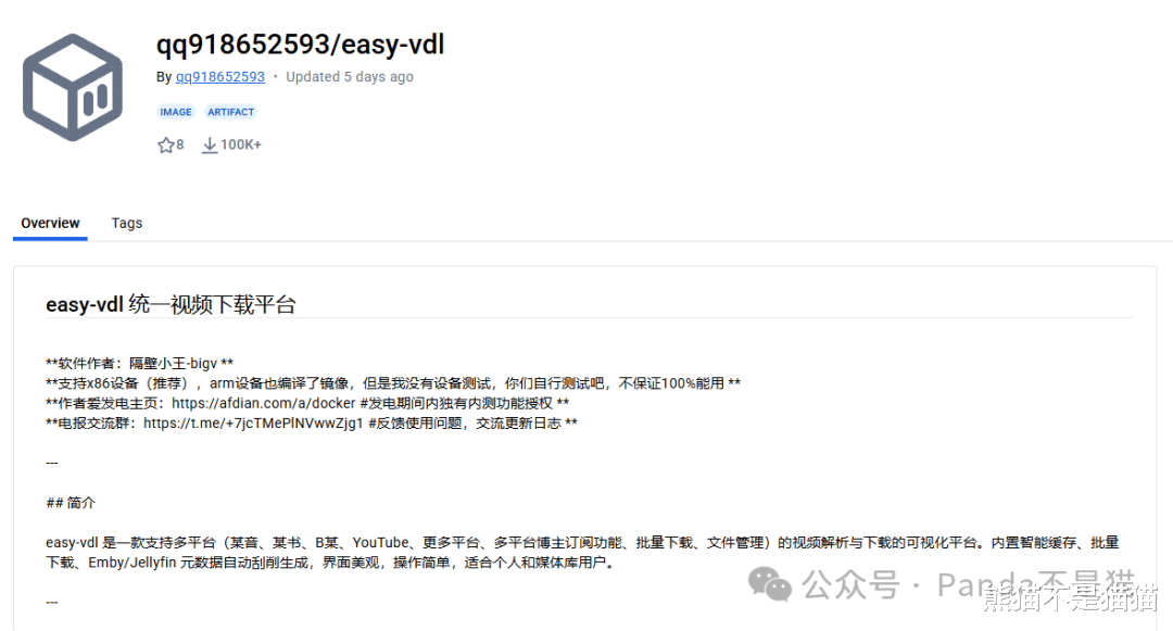 项目在DockerHUB进行保存,除了支持x86,也有arm镜像,作者虽说没有尝试测试,但熊猫测试过了,至少在绿联的DH4300上面是支持运行的。