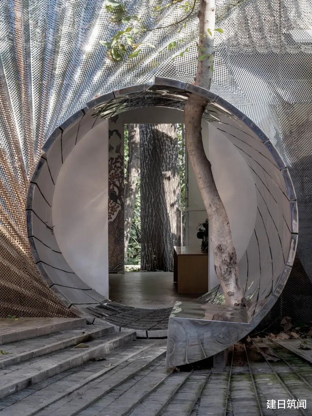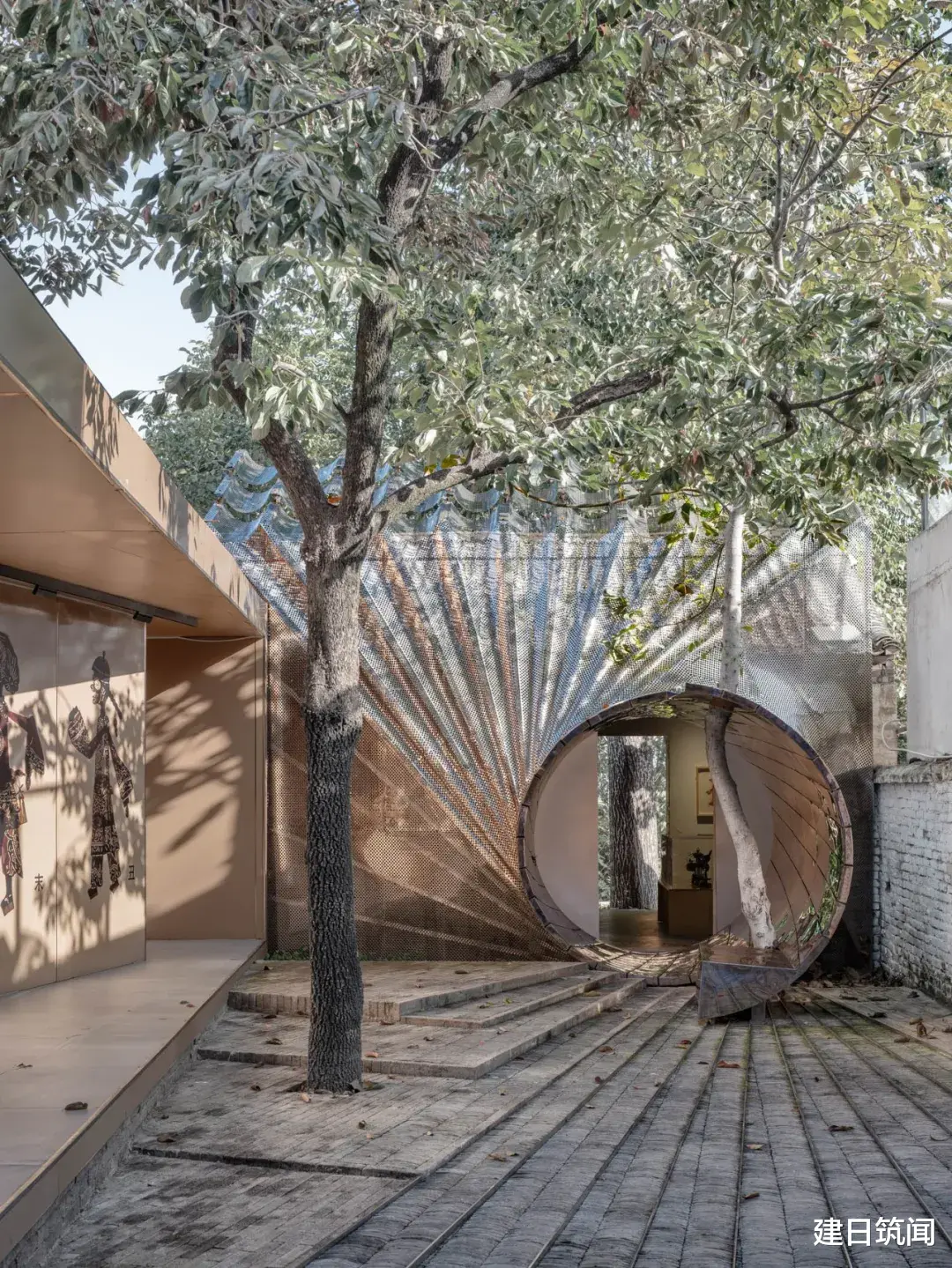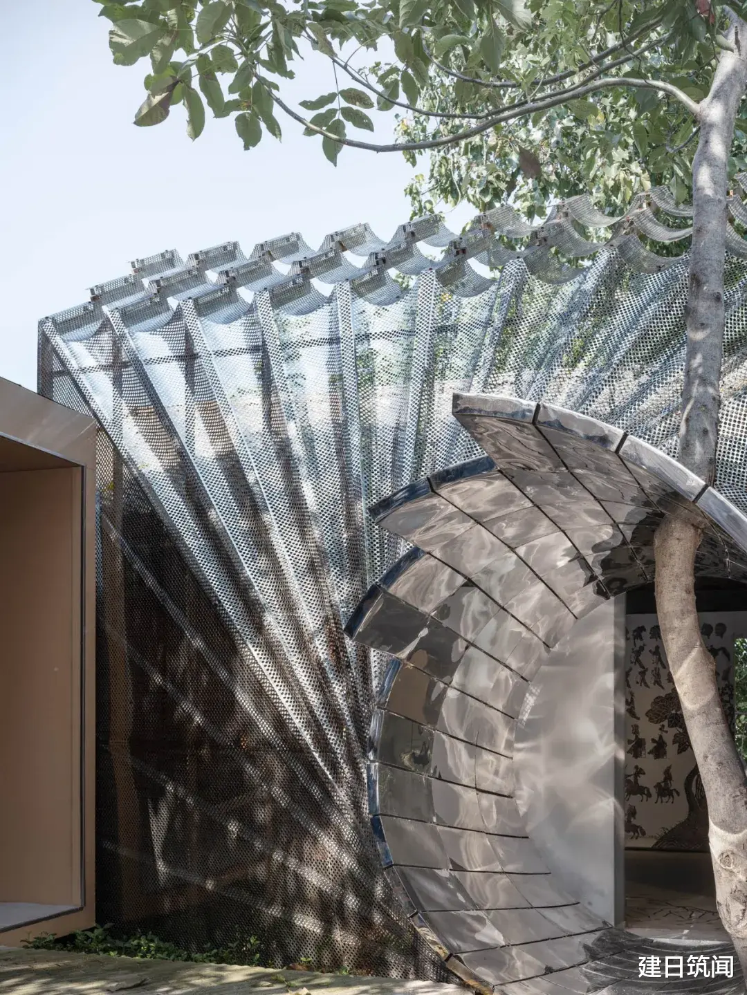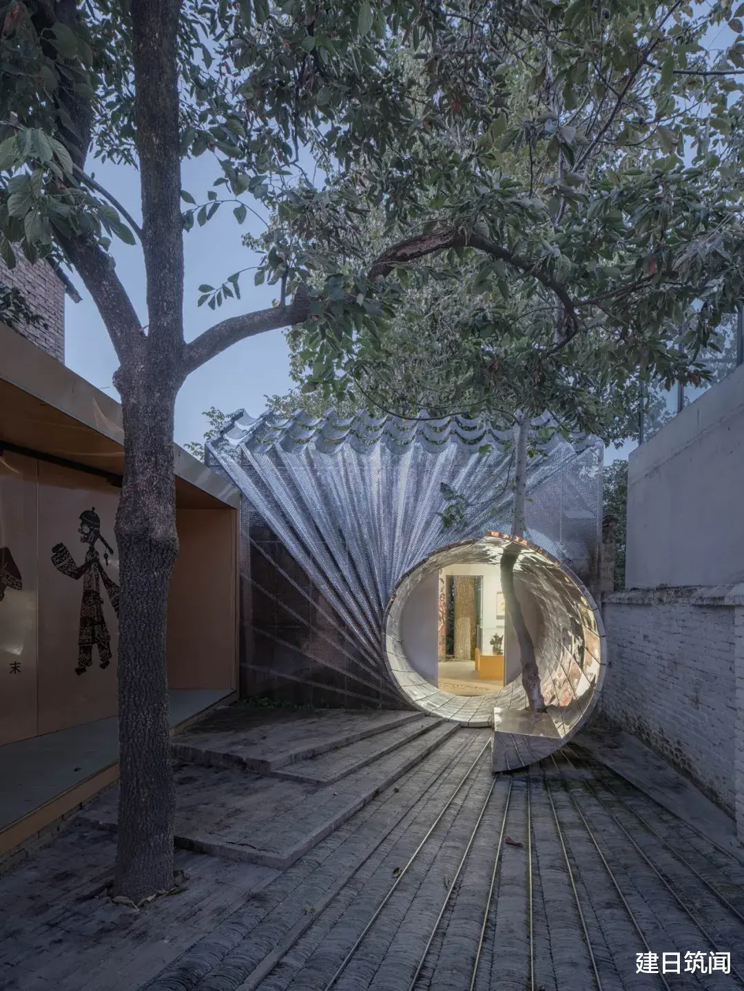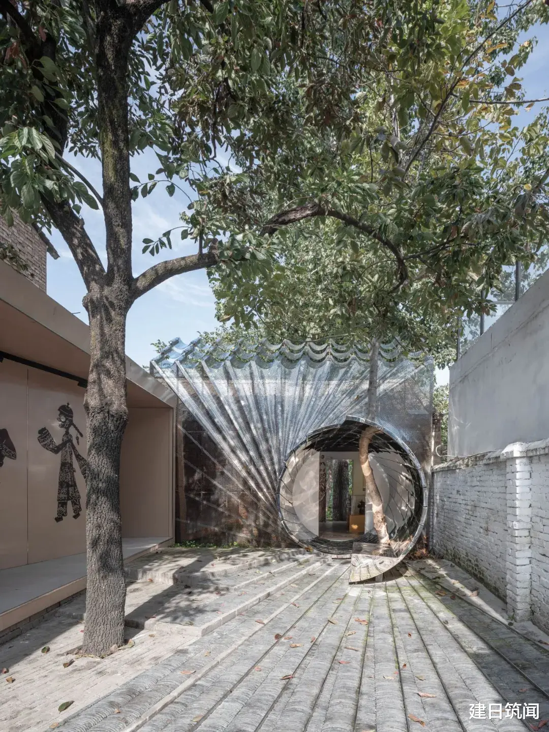 设计团队提取了当地民居惯用的波浪形底瓦元素,让其顺着倾斜的屋顶流淌而下形成一个类似窗帘的立面肌理。而后展厅的入口插入一个圆形通道,这个通道吸引并邀请观众向院子的北端进行探索。