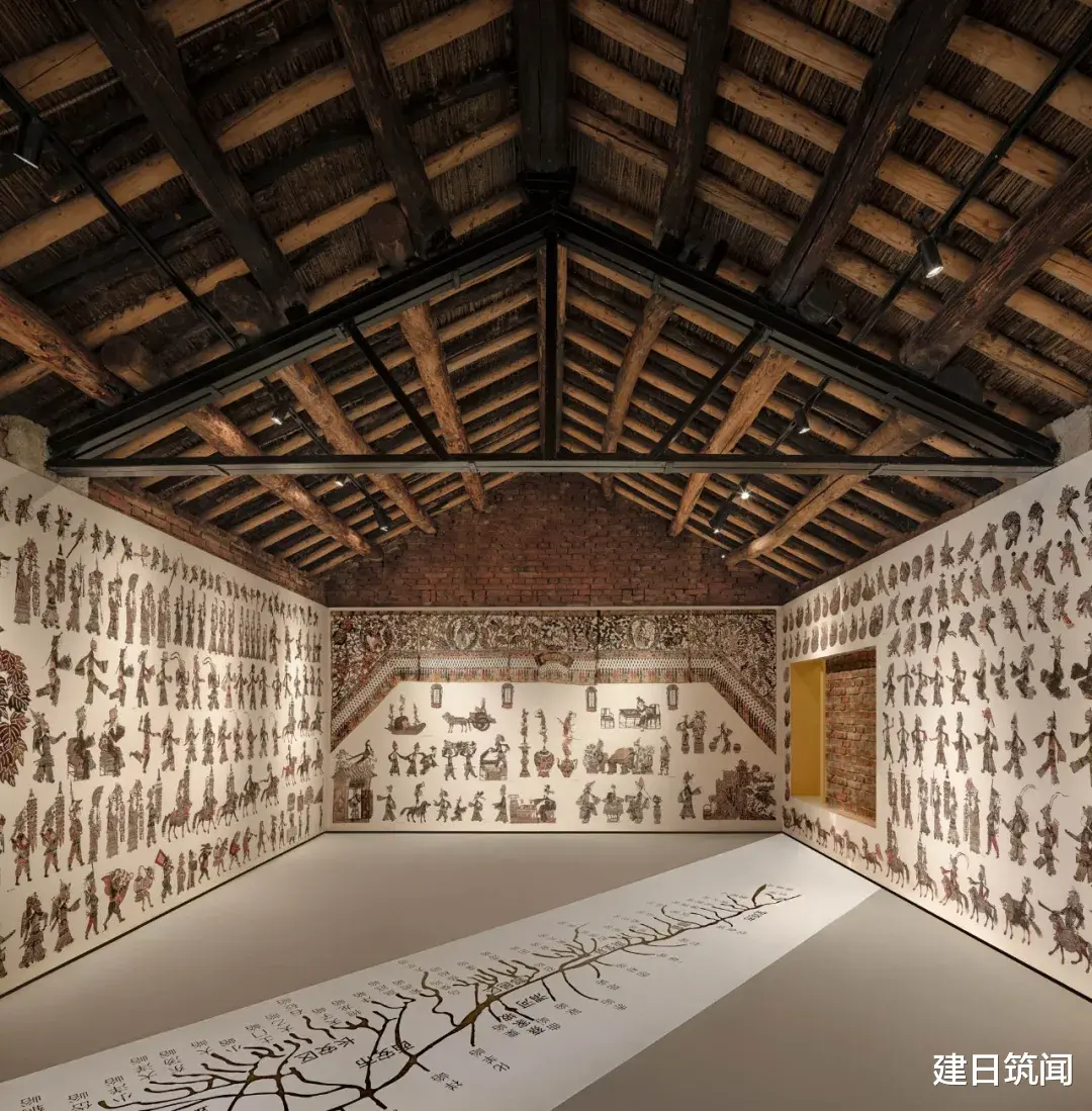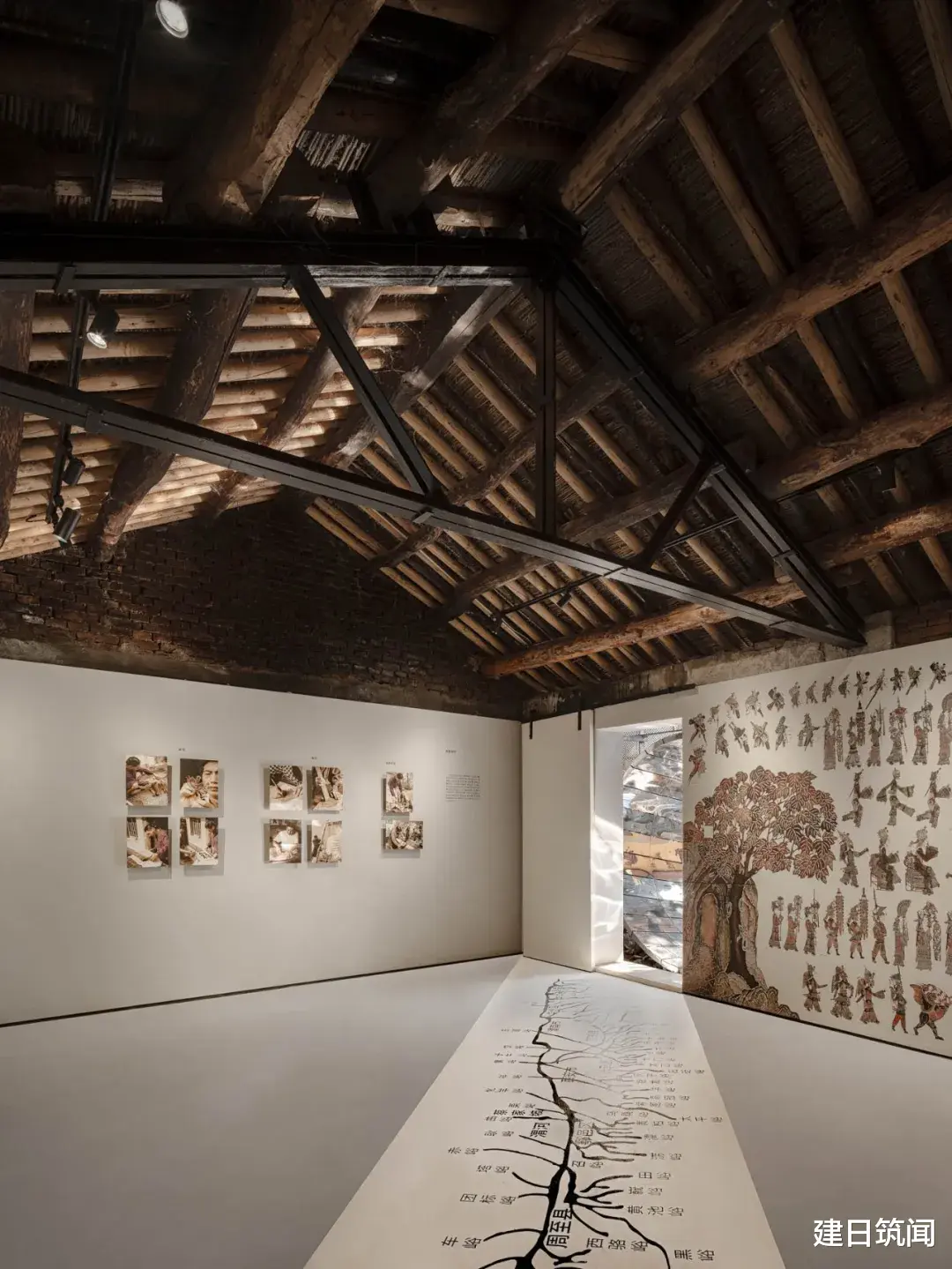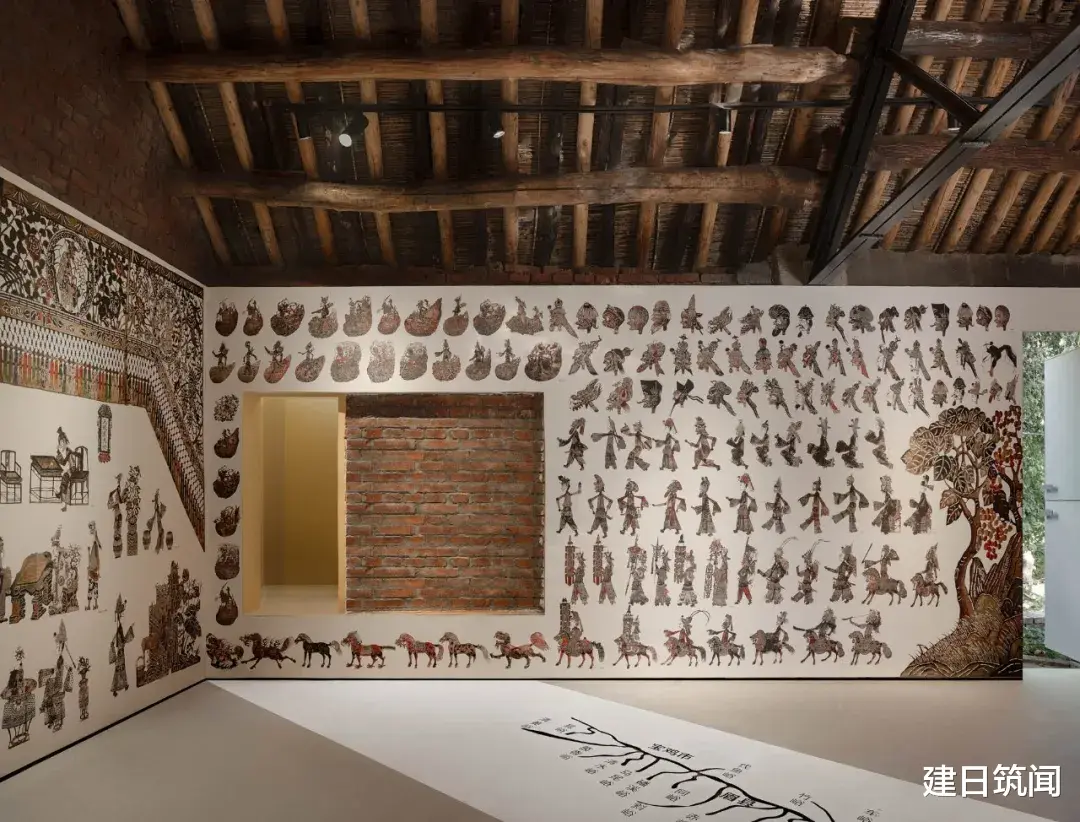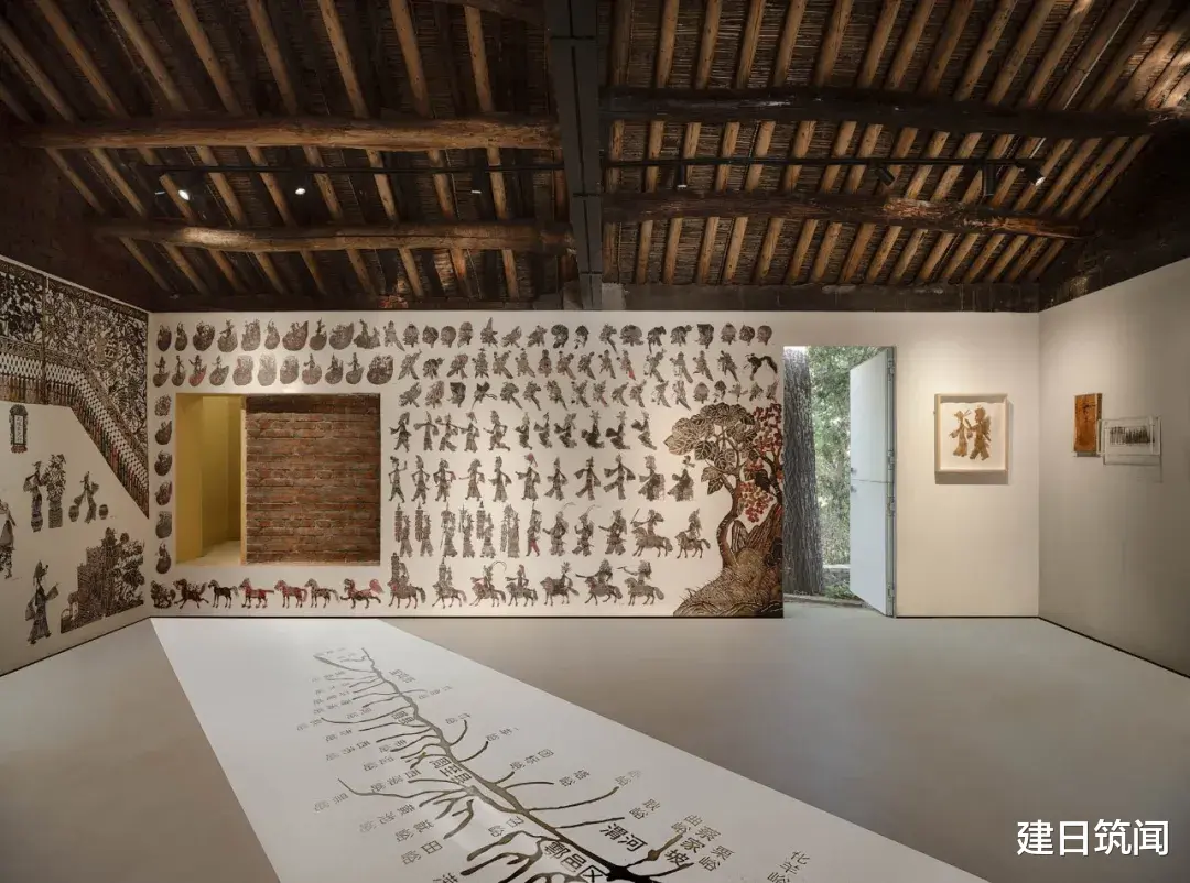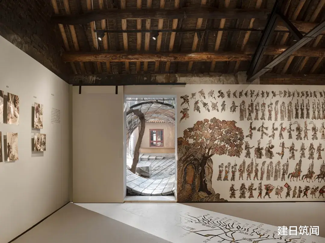 设计团队提取了当地民居惯用的波浪形底瓦元素,让其顺着倾斜的屋顶流淌而下形成一个类似窗帘的立面肌理。而后展厅的入口插入一个圆形通道,这个通道吸引并邀请观众向院子的北端进行探索。