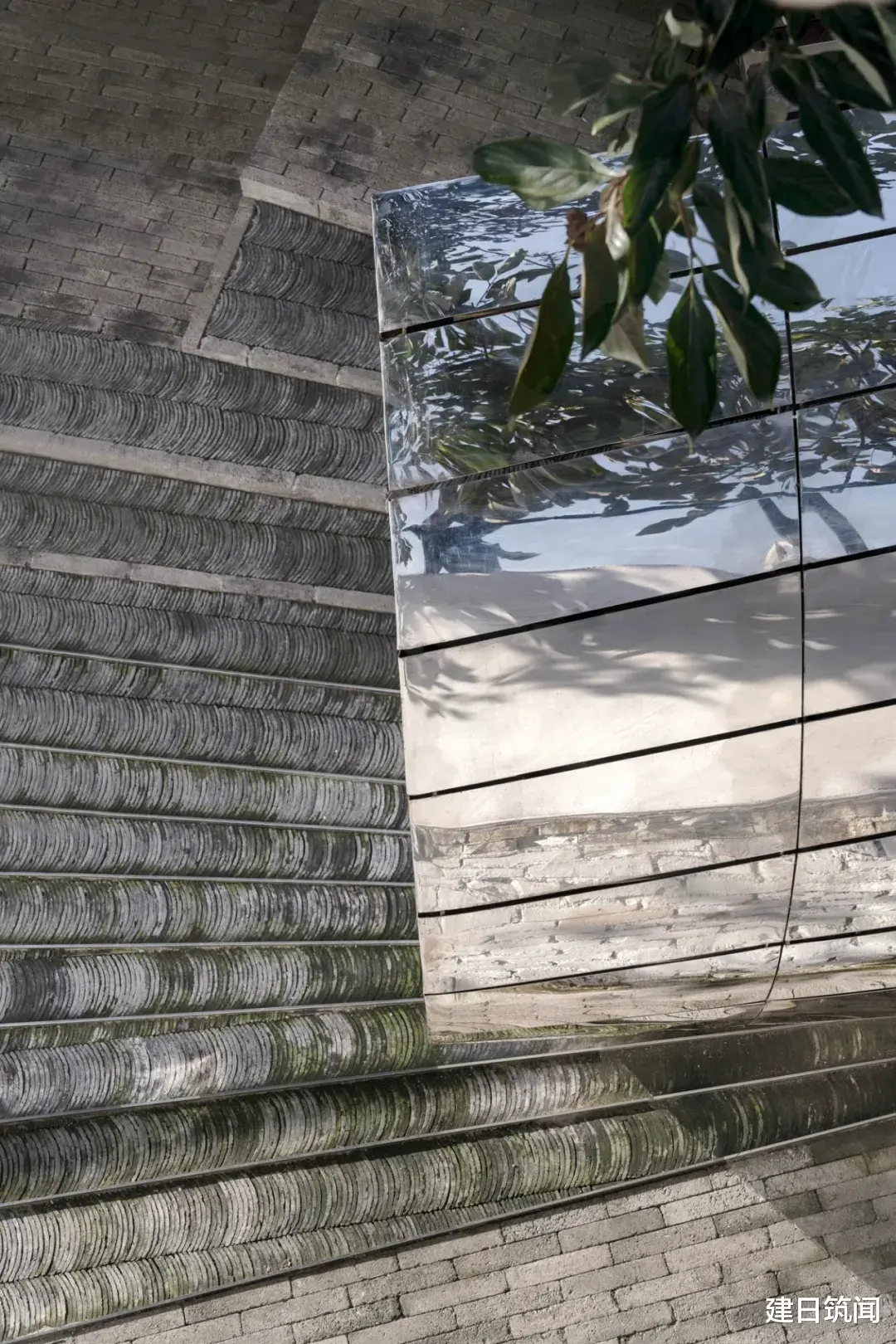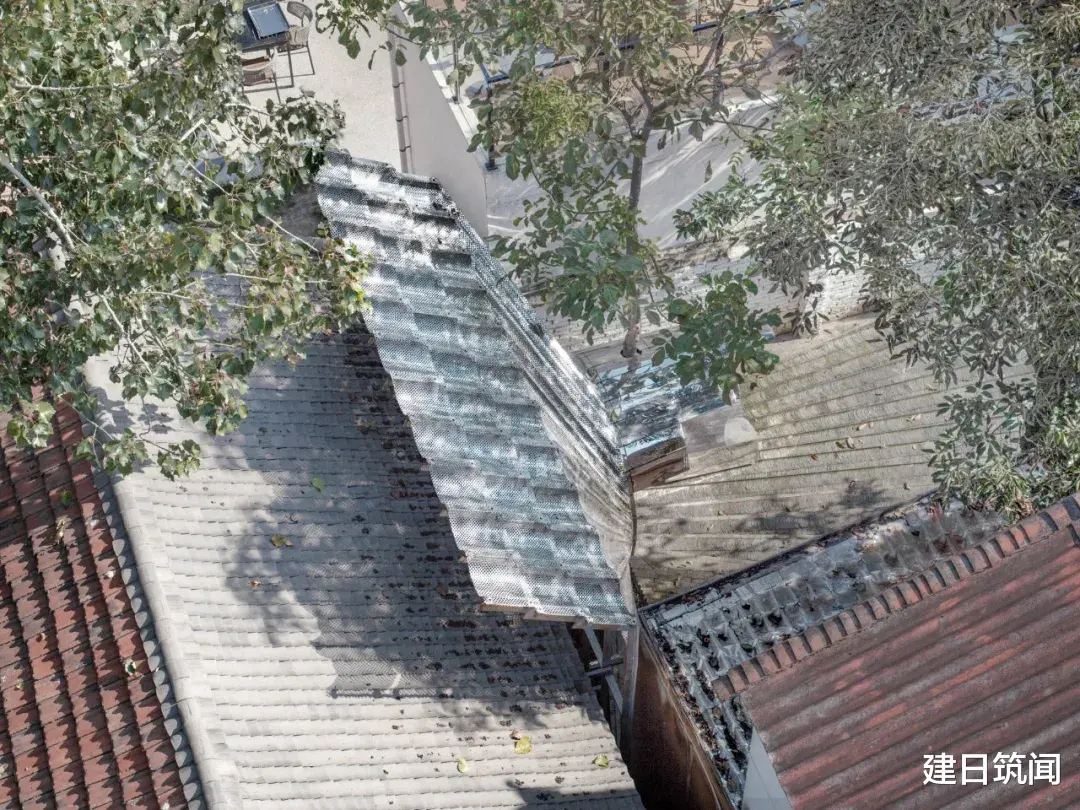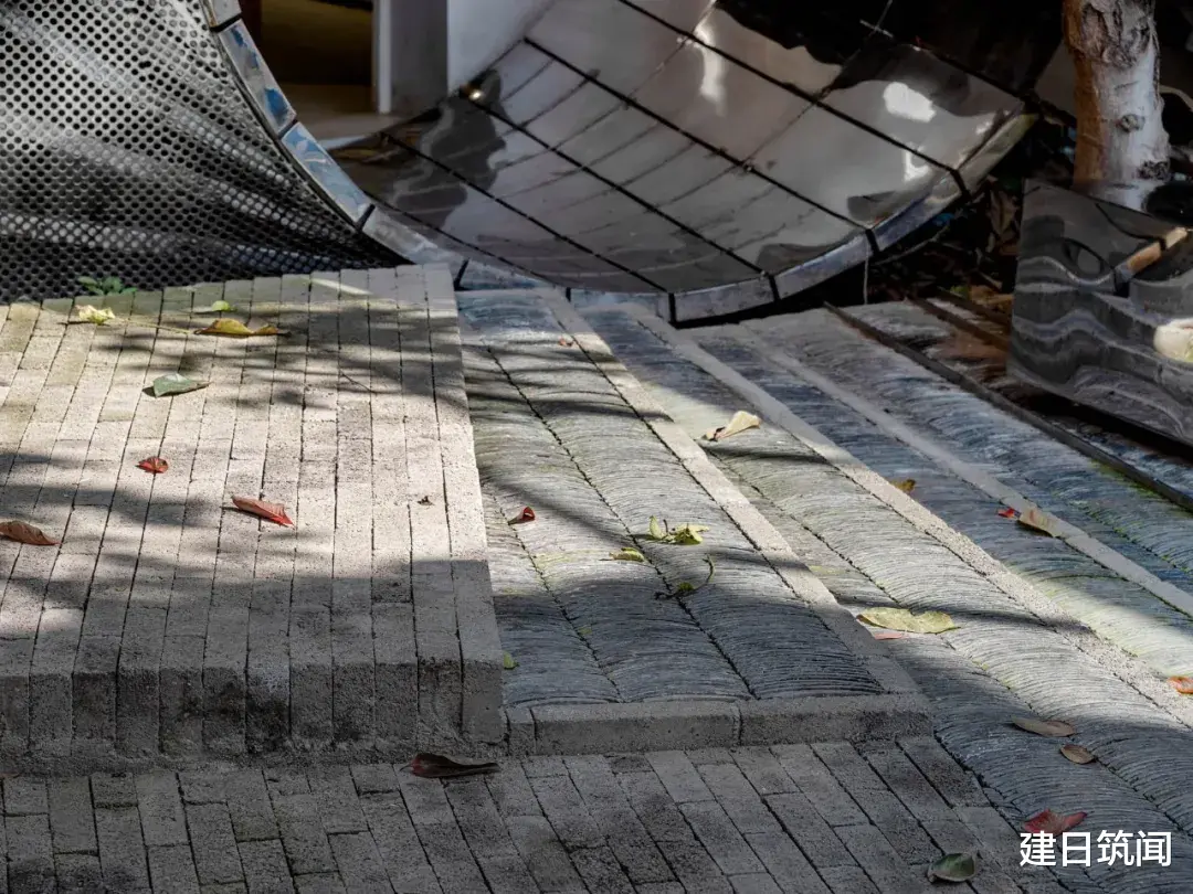 设计团队将金属穿孔板在工厂进行分段预制,现场拼装用了两天的时间。金属孔的大小和间距被反复推敲,以同时获得透明,镜像反射,和产生阴影的多层效果。人们在不同的时间来到庭院,会遭遇到全然不同情境氛围。有的时候蓝天和阳光会作为镜像主体覆盖住后面的砖墙;有的时候金属网本身会变得透明,原有的房屋会凸显出来。设计团队期待可以通过这样一种方式为人们带来流水的想象。