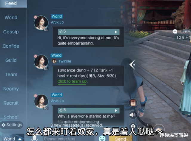 公屏上看到很多人在发:“Why is everyone staring at me?It's quit embarrassing!”(怎么都在盯着奴家看,真是羞人答答)。老外不断打着这样的虎狼之词,有人竖起了兰花指,有人撑起了油纸伞,画面十分劲爆。