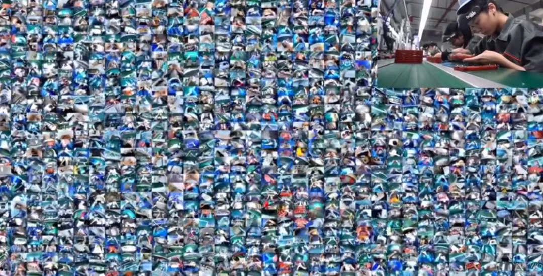 一家公司将AI摄像头绑在2000多名工人身上,记录他们在产线上的一举一动,形成10000多小时的视频,用于训练AI系统。画面上的每一个小方块都是工人工作的视频。