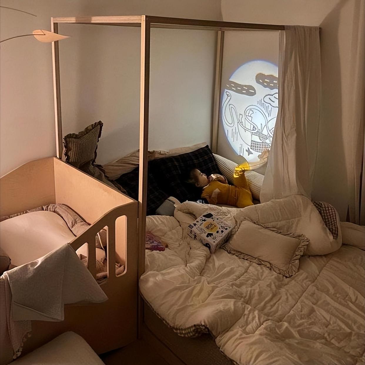 大女儿有一张独立小床,旁边摆着一张大床和两张摇床,虽然看着有点挤,但一家五口挤在一起的感觉,真的太温馨、太有爱了。
