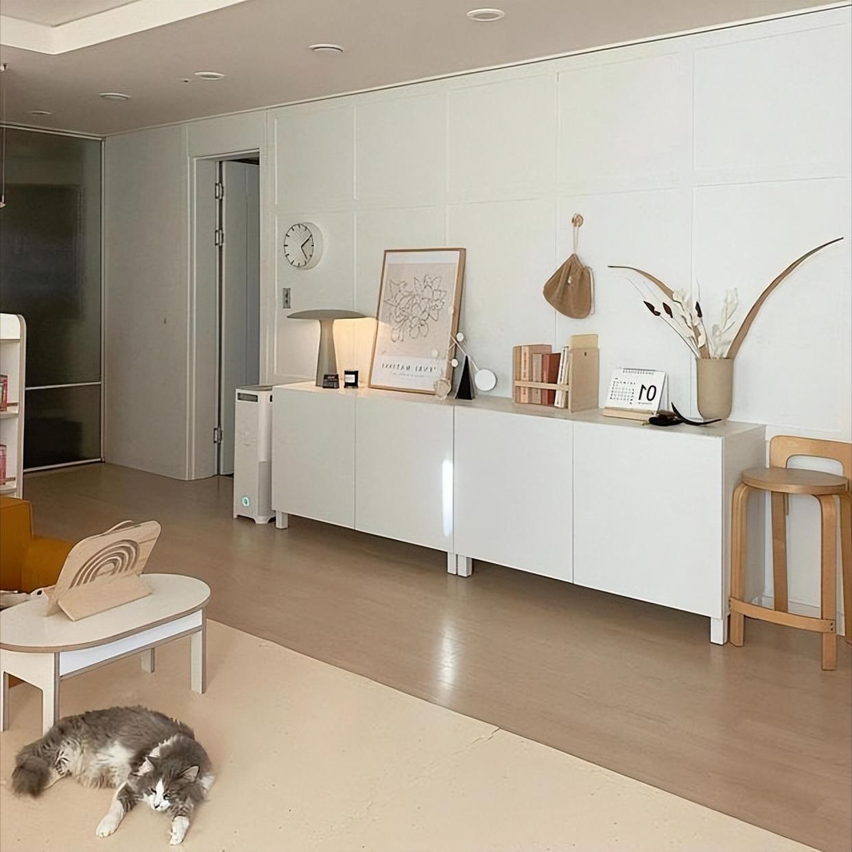 客厅侧壁摆了一个白色柜子,浅色系特别显沉稳,关键是柜子内部储物空间超大,家里的零碎杂物全能塞进去,随放随拿,不用堆在外面,客厅自然显得干净明亮。