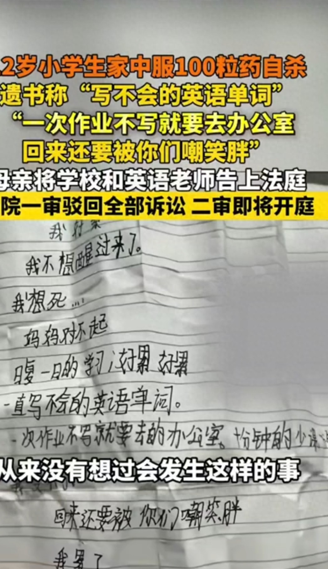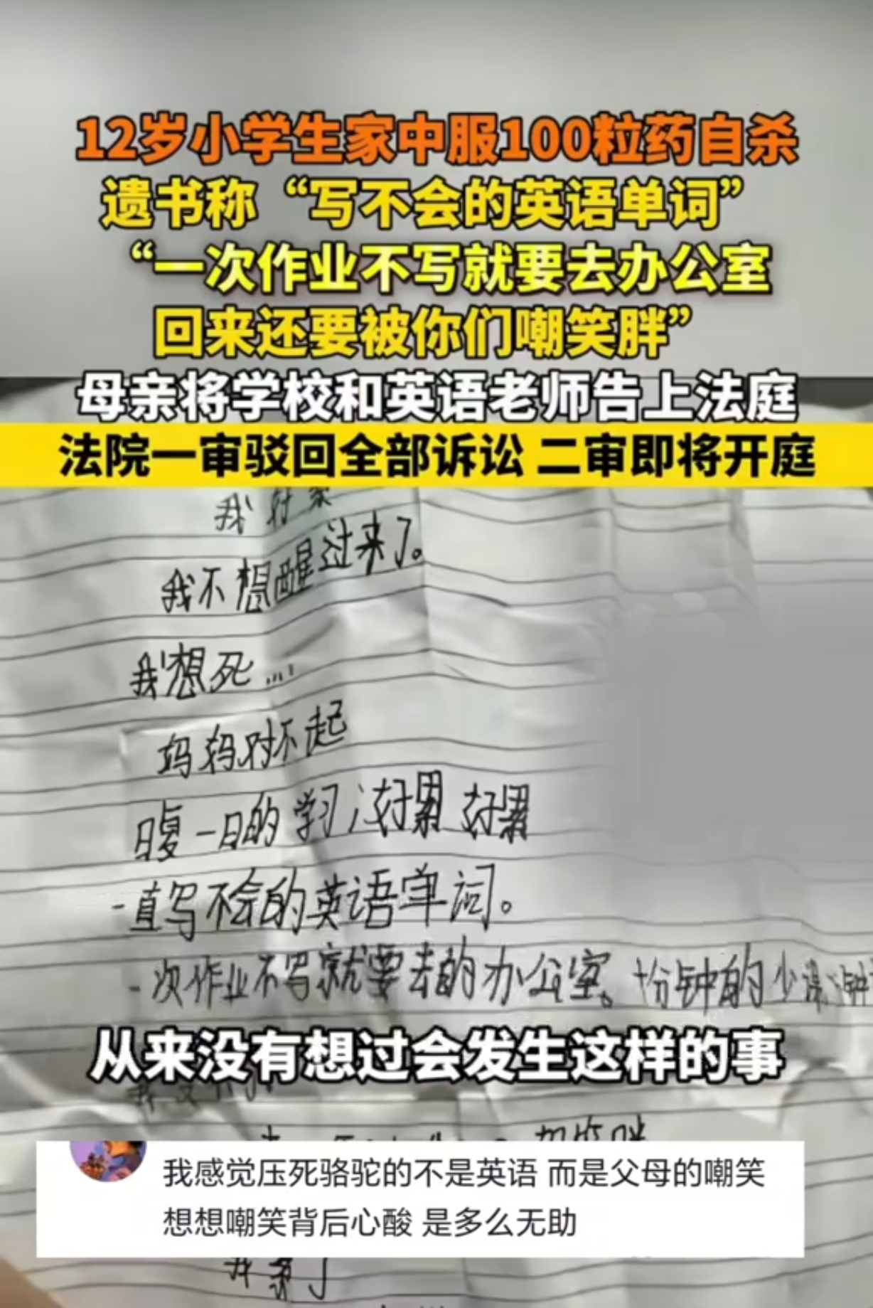 转折点藏在女孩的遗书里:“不会英语单词,作业不写要去办公室,回来还被嘲笑胖”。原来压垮她的不只是解不出的单词、写不完的作业,还有那些无人倾听的委屈。这个曾获评“优秀少先队员”、爱把妈妈写进小说里的孩子,终究没敢把心里的崩溃说出口。