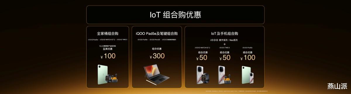 iQOO Pad5e、iQOO WATCH GT 2 和 iQOO TWS 5 的售价分别是 1999 元起、499 元起和 399 元,组合购买更优惠。