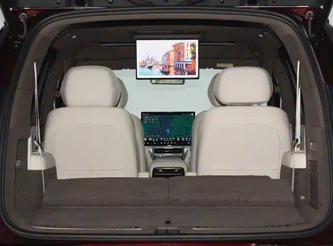 内饰以对称式中控台为核心,13.2英寸全液晶仪表、17.3 英寸悬浮中控屏与旗舰型专属的 50 英寸 AR-HUD 形成三屏交互,搭载腾势OS 2.0系统,支持无麦 K 歌与AI 语音交互。材质上,尊荣型采用高级皮质包裹,旗舰型则升级为 Nappa 真皮,搭配 128 色氛围灯与金属饰条,豪华质感扑面而来。前两排座椅标配加热、通风、按摩功能,主驾带主动侧翼调节,旗舰型副驾升级为零重力座椅并配备腿托。第三排支持电动前后 10cm 调节与靠背角度调节,还标配加热功能。