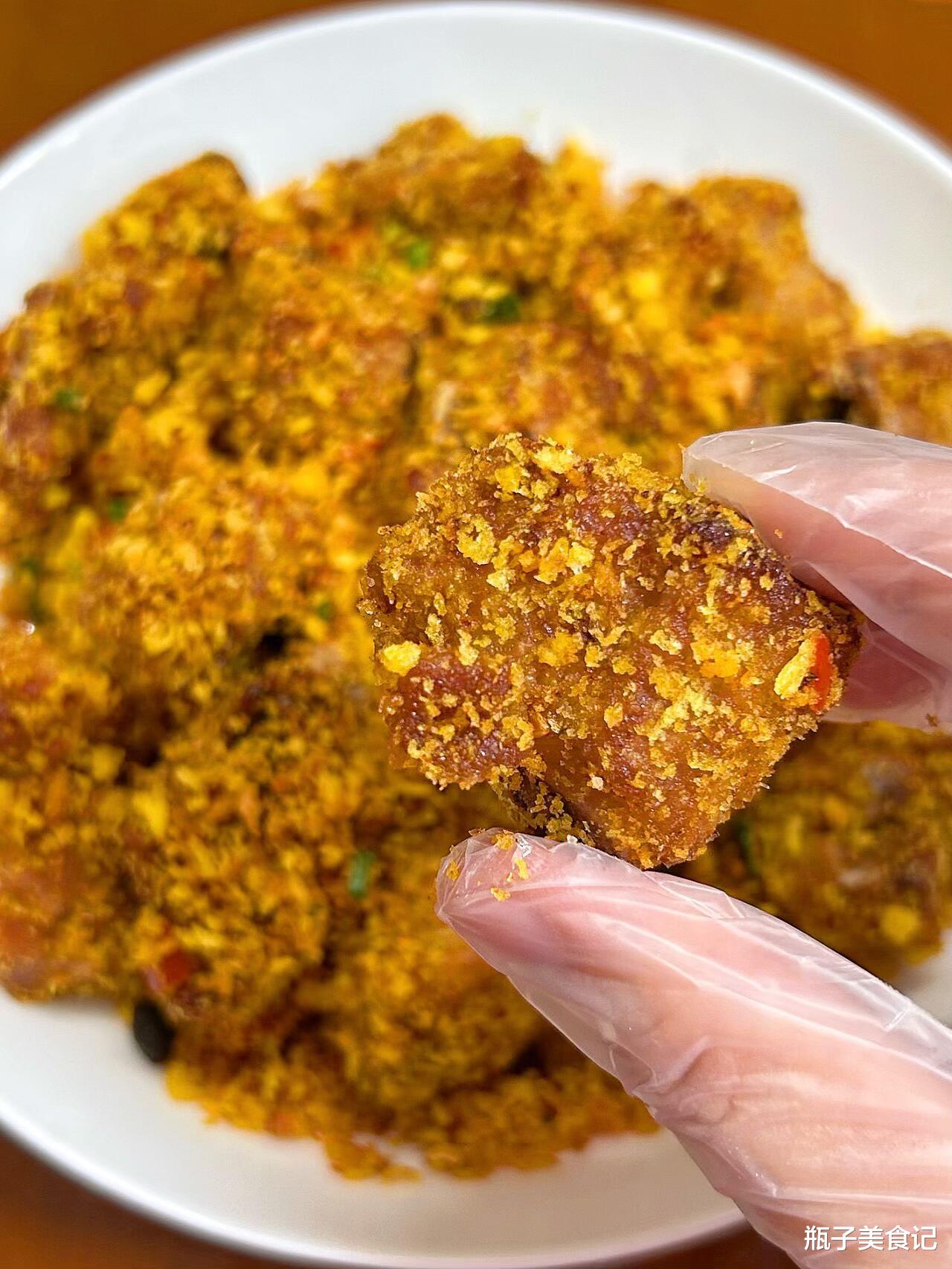 锅里留少许底油,放入炸好的排骨快速翻炒,撒入炒好的面包糠和金蒜,再撒一把豆豉(提前用料酒泡软),最后淋半勺生抽提鲜。快速翻炒让每根排骨都裹满金蒜和面包糠,像穿上了闪亮的黄金战衣。出锅前撒把葱花,红绿相间特别上镜。