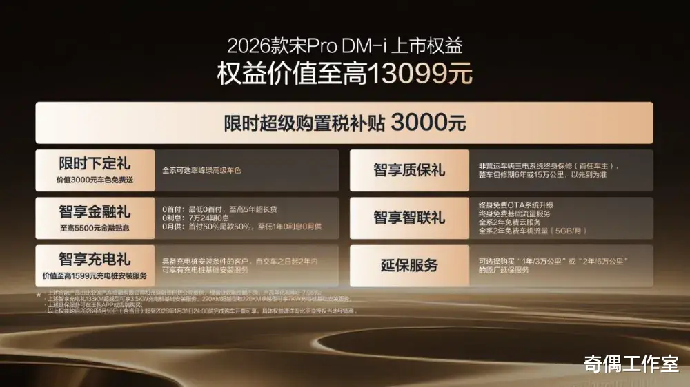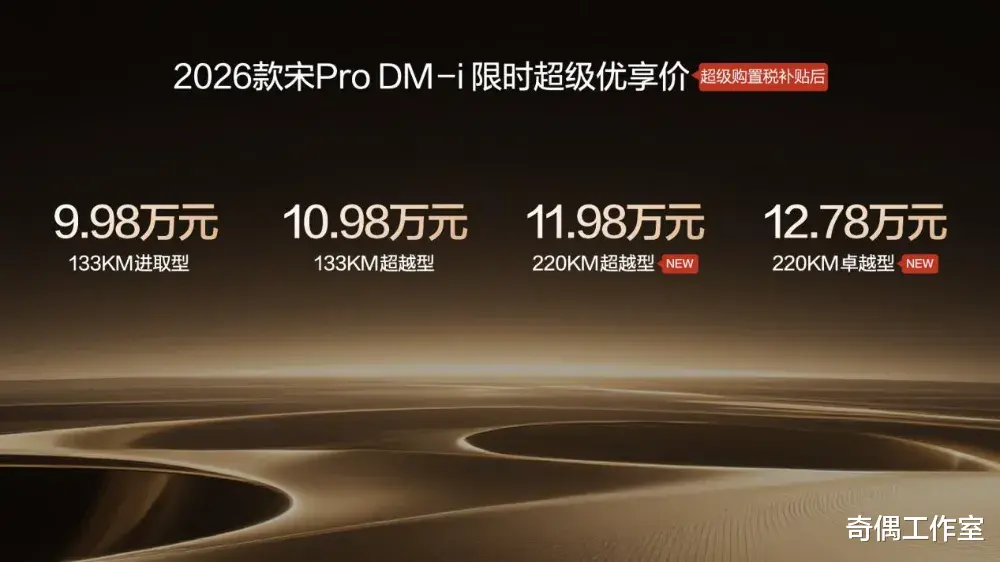 2026年1月10日,比亚迪正式宣布2026款宋Pro DM-i上新220km长续航版本,全系限时超级优享价9.98-12.78万元。220km纯电续航版,限时11.98万元起!A级插混SUV很值!