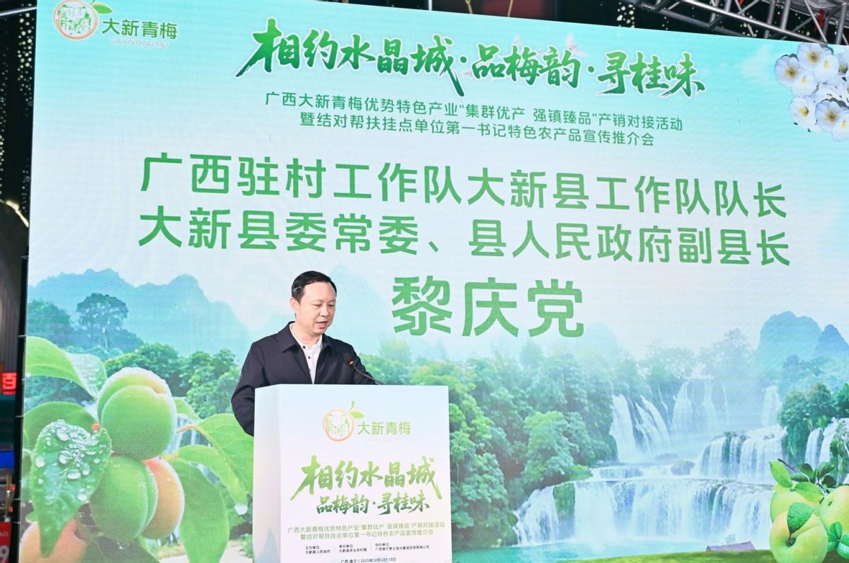 广西驻村工作队大新县工作队队长、大新县委常委、副县长黎庆党在致辞中介绍,目前大新县青梅种植面积达5.6万亩,年产量4.8万吨,主导产业产值2.1亿元,带动一二三产业融合产值突破13.72亿元,青梅已成为名副其实的“富民果”“振兴果”。