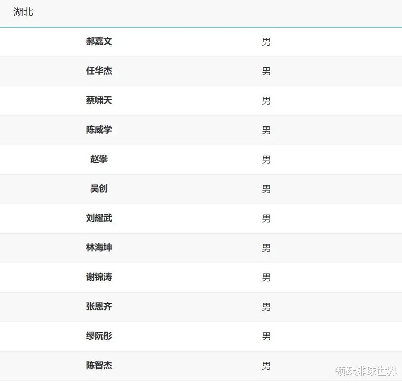 湖北男排全运会12人名单:郝嘉文、任华杰、蔡啸天、陈威学、赵攀、吴创、刘耀武、林海坤、谢锦涛、张恩齐、缪阮彤、陈智杰