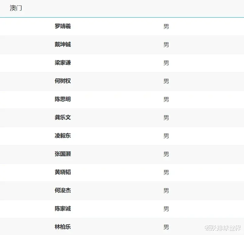 澳门男排全运会12人名单:罗靖羲、戴坤铖、梁家谦、何树权、陈思明、龚乐文、凌毅东、张国灏、黄晓韬、何浚杰、陈家诚、林柏乐