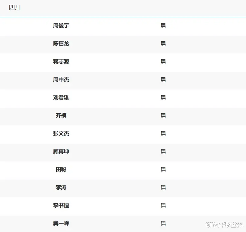 四川男排全运会12人名单:周俊宇、陈禧龙、蒋志源、周中杰、刘君雄、齐祺、张文杰、顾再坤、田聪、李涛、李书恒、龚一峰