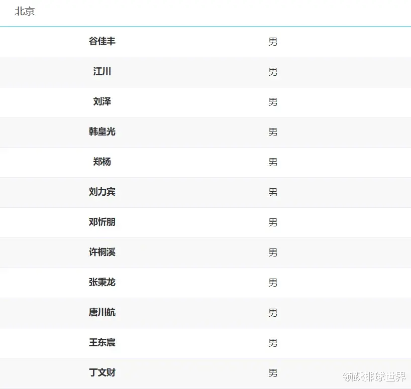 北京男排全运会12人名单:谷佳丰、江川、刘泽、韩皇光、郑杨、刘力宾、邓忻朋、许桐溪、张秉龙、唐川航、王东宸、丁文财