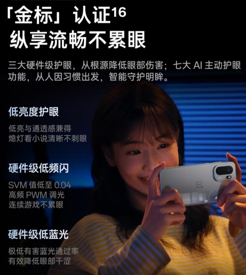 一加Ace 6的最大亮点之一是采用了165Hz超高刷新率屏幕,相比传统的120Hz屏幕,每秒可多显示45帧画面 1 2 3 。这不仅是参数上的提升,更是实际体验的飞跃。针对游戏场景,这块屏幕还支持3200Hz瞬时触控采样率和触显同步技术,触控响应速度提升15%,实现"指哪打哪"的精准操作。显示效果上,Display P3芯片优化色彩准确性和流畅度,无论是游戏还是观影都极具沉浸感。这块屏幕还搭载了全新一代“明眸护眼”技术,结合硬件级低蓝光和AI智能调光,有效减少视觉疲劳。