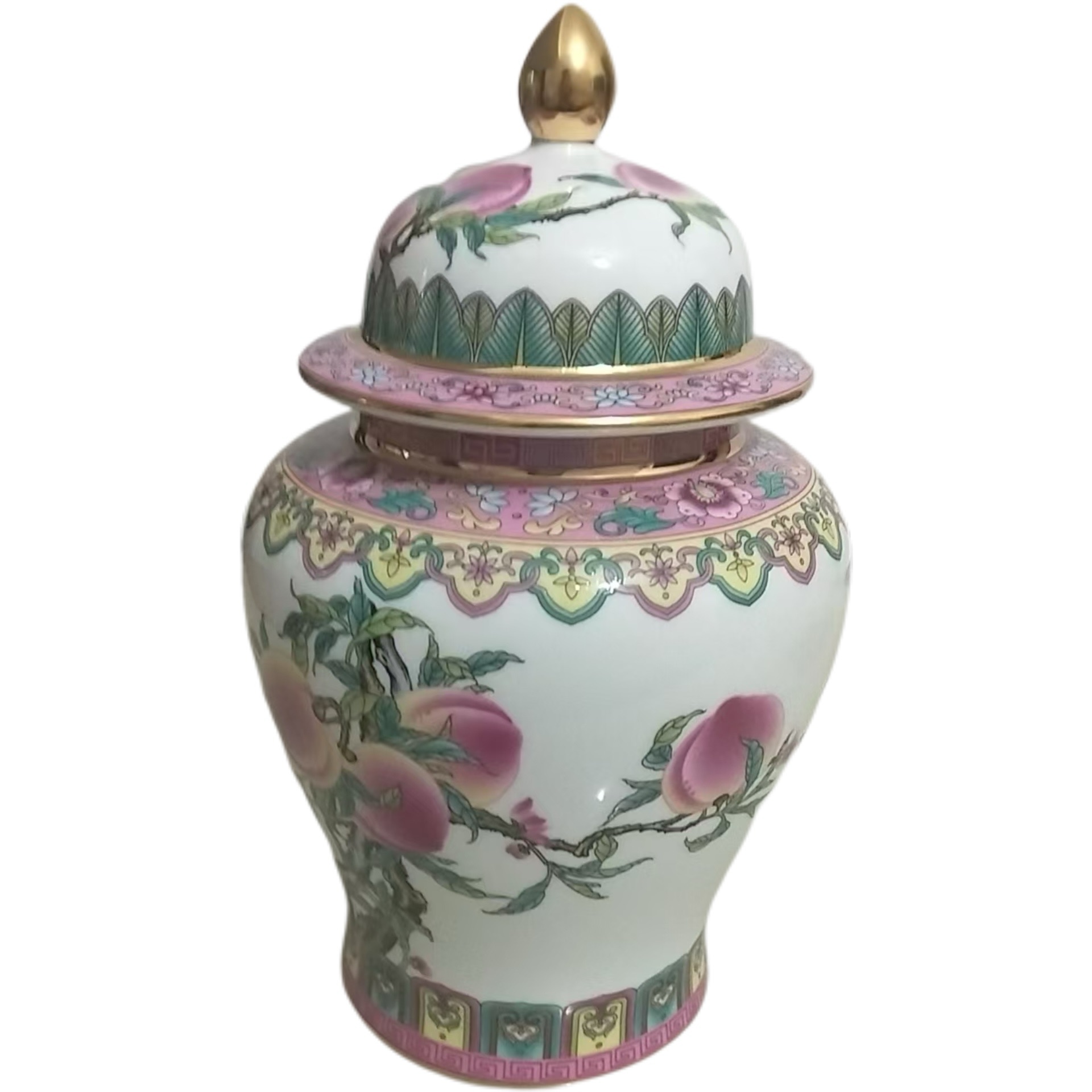 罐身的 “九桃五福” 纹饰,是王锡良粉彩技艺的巅峰展示,每一笔都藏着吉祥寓意与瓷艺密码。