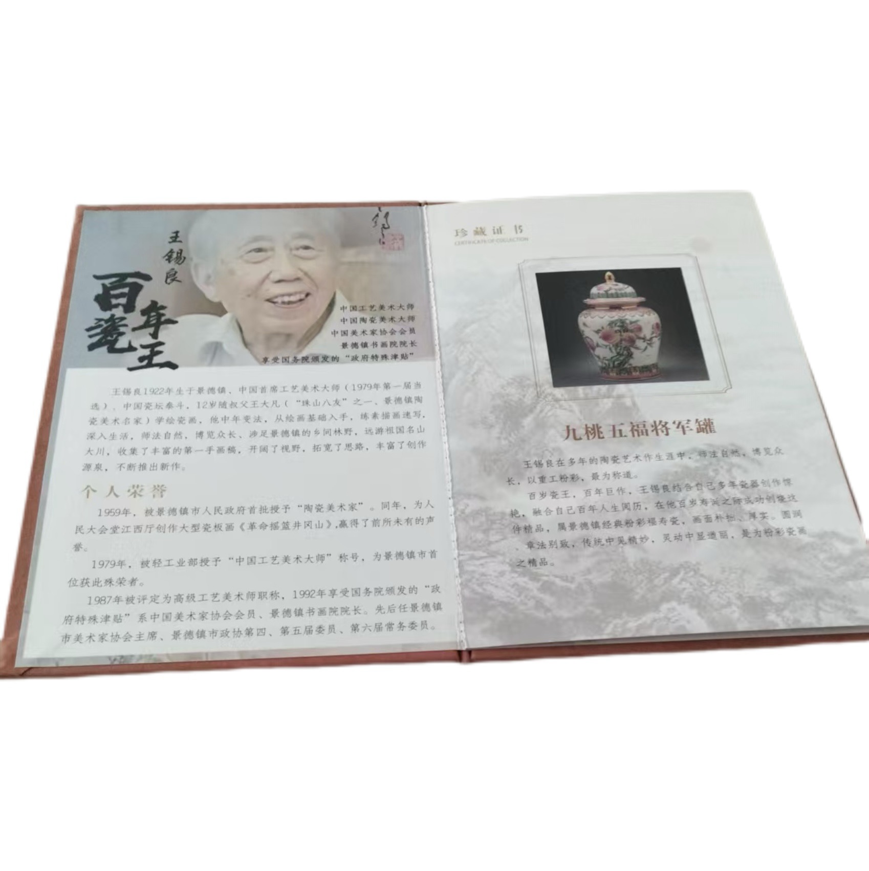 在景德镇千年瓷史的星河中,王锡良是当之无愧的 “北斗”。这位百岁瓷坛泰斗以毕生心血熔铸瓷艺,将传统粉彩推向新的艺术高度。眼前这尊《九桃五福将军罐》,便是他晚年艺术的集大成之作 —— 以 “九桃” 喻长寿,“五福” 寄吉祥,将军罐的雄浑器型承载着百年匠人的生命哲思,在现代瓷艺领域树起一座不朽的丰碑。一、巨匠传奇:王锡良与景德镇的百年瓷缘