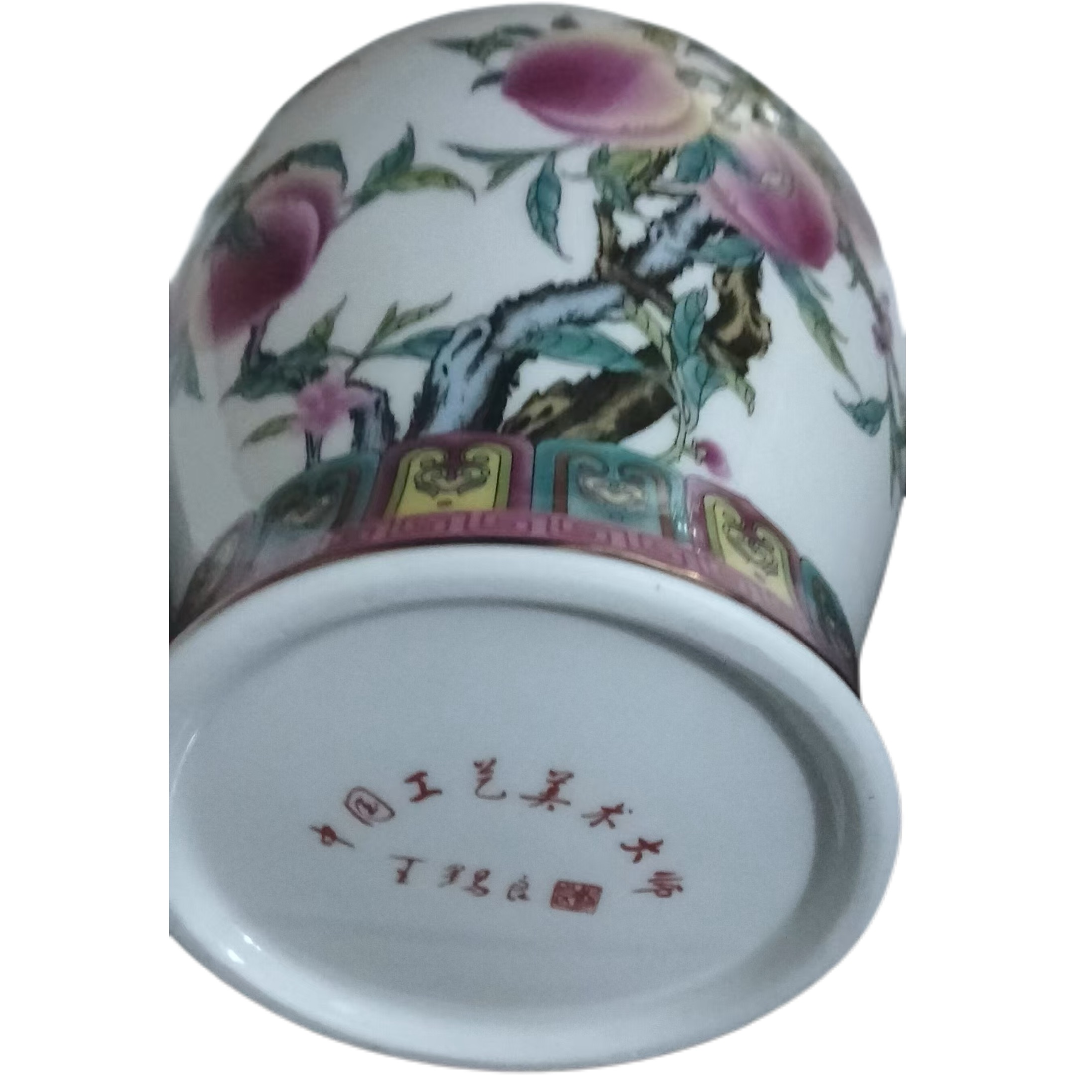 这尊将军罐采用 “重工粉彩” 技法,从起稿、勾线、填色到烧制,需历经数十道工序。王锡良的粉彩,最绝处在于 “色阶过渡”—— 他能在一枚寿桃上分出十余种粉色层次,让色彩自然晕染,毫无生硬感。罐身的金边装饰(盖钮、口沿、肩部)采用 “本金描绘”,经高温烧制后金光璀璨,与粉彩的柔媚形成刚柔并济的视觉张力,这是他对宫廷粉彩工艺的现代传承与创新。四、款识与收藏:大师印记的价值锚点