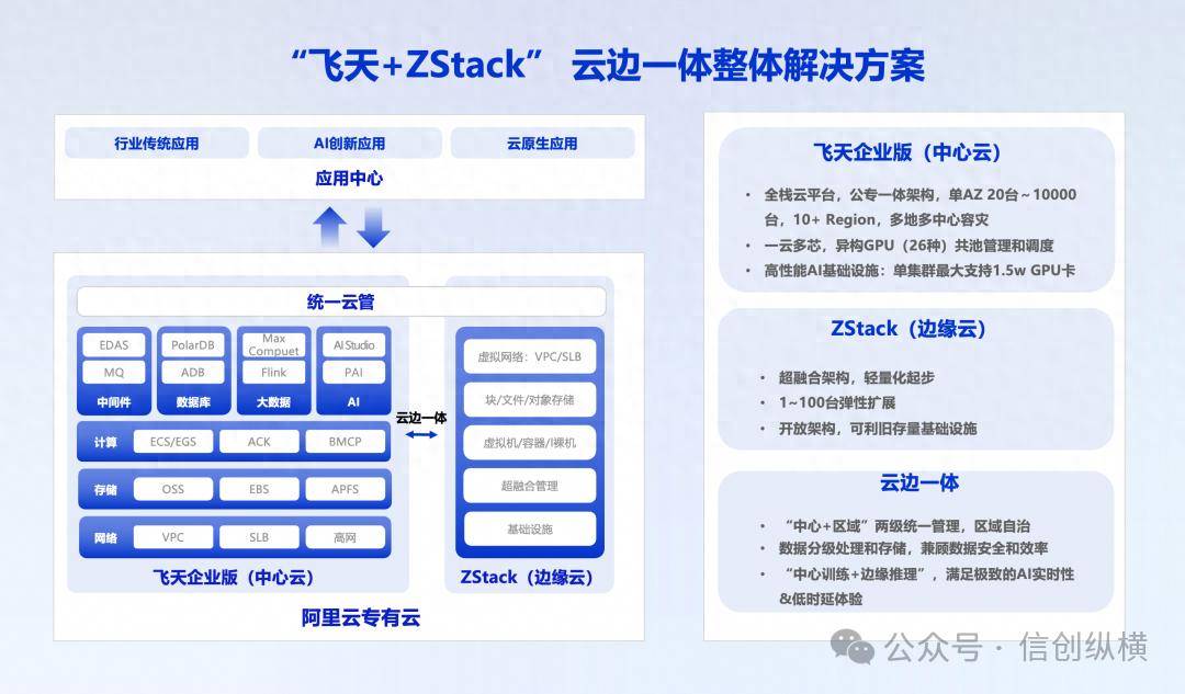 阿里云自主研发的飞天企业版支持一云多芯和大规模算力管理调度,擅长处理海量数据和高强度的AI模型训练;ZStack则以“轻量化、标准化”见长,能够将强大的计算能力快速搬到企业的办公楼、工厂甚至基站侧。