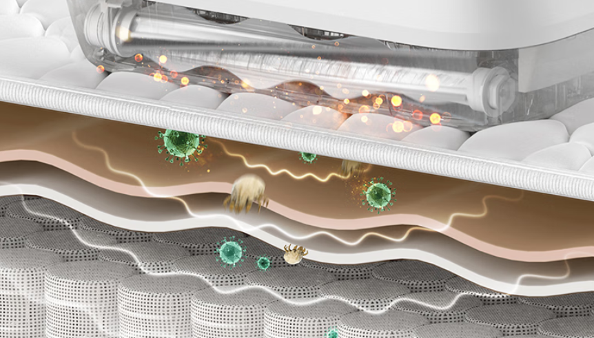 杀菌净化系统更是做到“双重保障”,5颗253.7nm波长紫外线灯珠组成广域阵列,形成全覆盖式杀菌区域,可深层穿透织物破坏螨虫细菌DNA,经权威检测杀菌率高达99.99%;叠加Deep-C超声波空化微气泡渗透技术,每秒20000次高频声波能分解螨虫排泄物等致敏源,解决传统除螨仪“杀螨不除敏”的痛点。