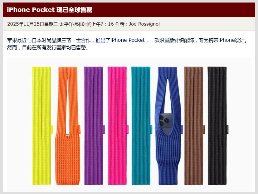值得一提的是,同样于本月推出的iPhone Pocket收纳配件,其售价高达1299元起,目前也已在全球所有发行地区售罄。