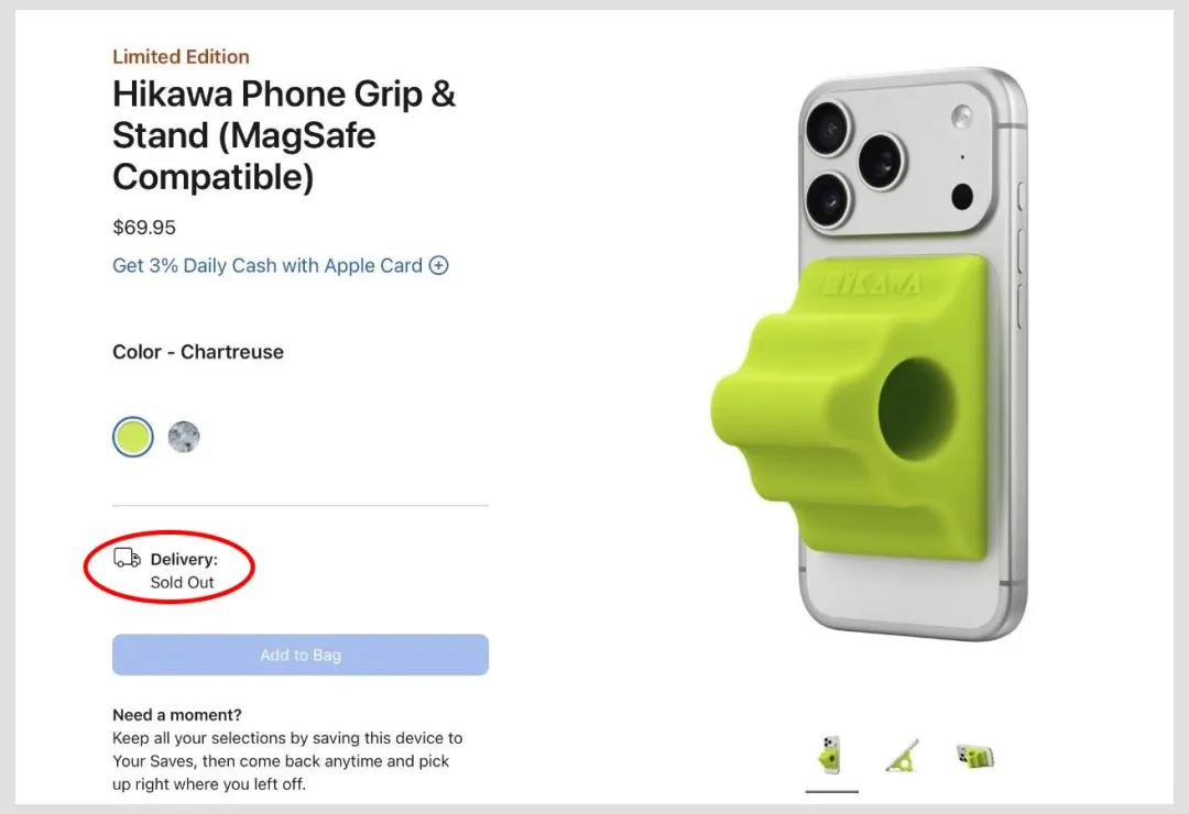 虽然定价较高,但完全不影响销量。据苹果官网显示,目前这款握把已经售罄。由于是限量款,不确定后期苹果是否还会补货。