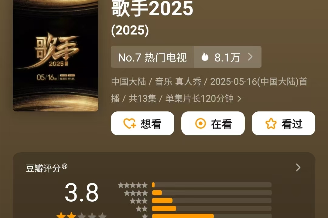豆瓣评分3.8分。随着吐槽、争议屡屡把《歌手2025》带上热搜、话题榜,偃旗息鼓的它,像泄了气的皮球,瞬间没了火力值。而它的评分也似乎降到了“冰点”。