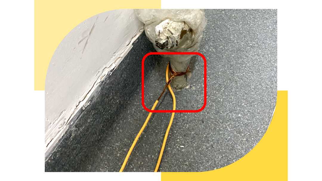 正确做法:使用适当的绝缘材料包覆裸露导线;请电气专业人员对设备电源线进行查验,确保设备可靠接地;在设备及围栏上张贴“有电危险”警示标识